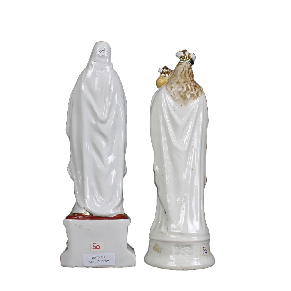 2 SCULTURE in porcellana dipinta e lumeggiature in oro raffigurante Madonna Francia XIX/XX secolo h cm 29 x 9 x 7 - h cm 27 x 10 x 10