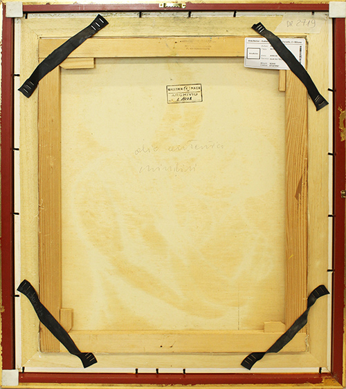 REMO BRINDISI, "Maternità", anni '90, olio su tela, 50x40 cm, con cornice 63x53x3 cm, 3,45 kg. opera archiviata dall'Archivio Remo Brindisi Catalogo Generale e archivio delle opere a cura di Gimmi Stefanini, Galleria d'arte Pace, Milano, tavola 1028. Al fronte: firma in basso a destra. Al verso: dichiarazione di autenticità da parte dell'artista e tecnica, timbro Galleria Pace e in alto a destra etichetta di Arte Atelier con informazioni. Opera con cornice.