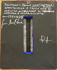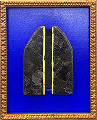 GIONI DAVID PARRA, "Sculpture's frame XXIV (portale), 2025, granito Volga blu e foglia oro 24 carati su acrilico blu oltremare su tavola intelata incorniciata, dim cm 27,5x22,5x3,5, peso 1kg. Al verso: titolo, anno, tecnica, misure, firma, 2 timbri e 2 sigle. Opera con cornice d'artista. Opera con autentica su foto dell'artista