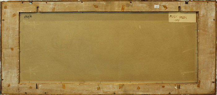 ALIGI SASSU, 1952, olio su cartoncino, 40x99 cm, con cornice 54x121x5 cm, peso 5,30 kg. Al fronte: firma in basso a destra. Al verso: firma e anno in alto a destra. Opera con cornice.