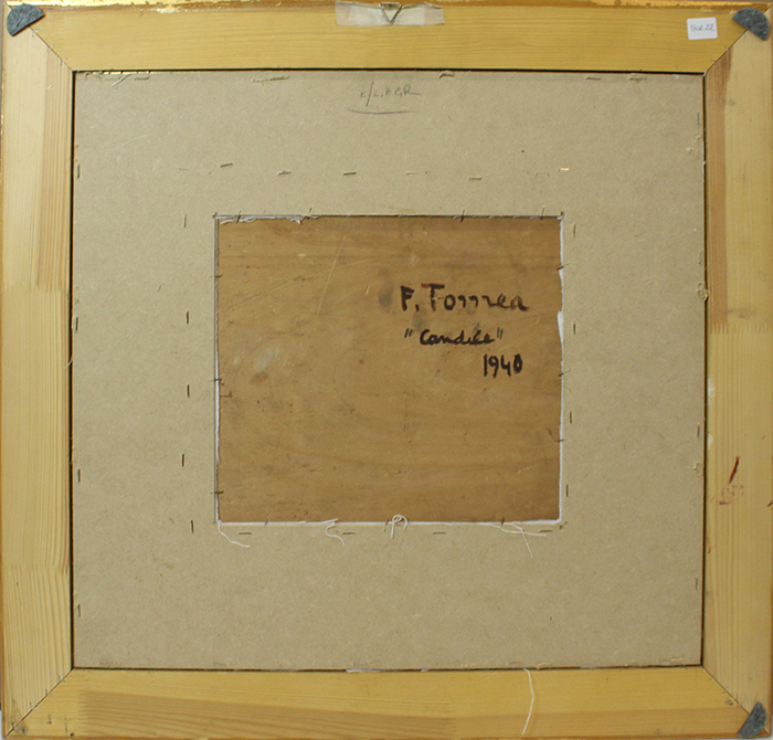 FIORENZO TOMEA, "Candele", 1940, olio su tela, 40x43 cm, con cornice 66x70x4,5, 5,50 kg. Opera con autentica su foto dell'artista. Al fronte: firma in basso a destra. Al verso: firma, titolo, anno. Opera con cornice.