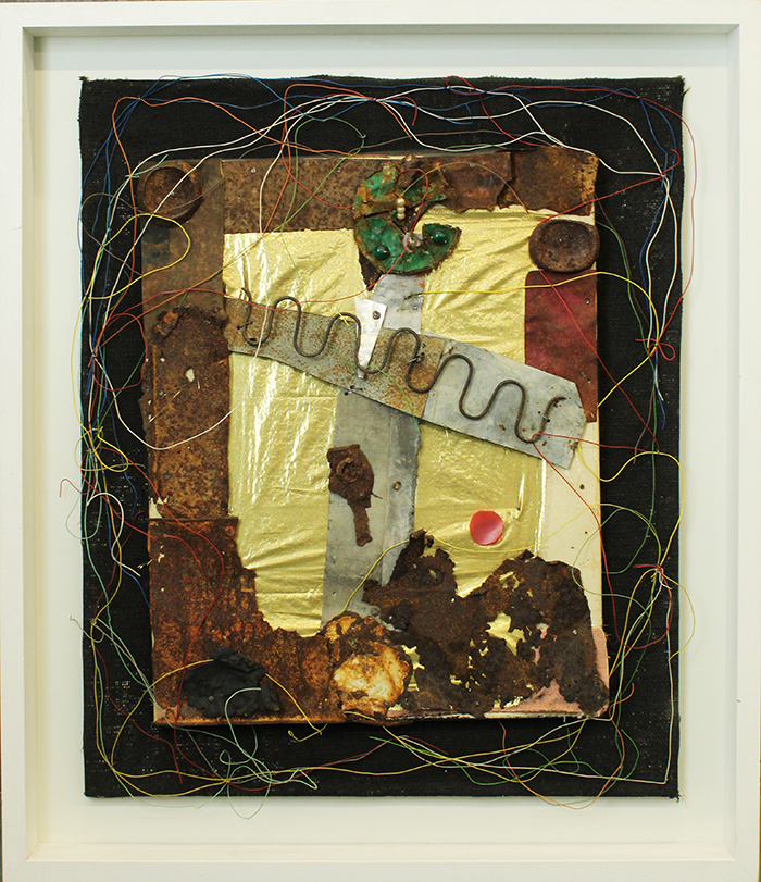 ANDREA RACCAGNI, "L'età dell'oro", 1983, tecnica mista e collage di ferri, 60x70 cm, con cornice 85x75x6 cm, peso 5,20 kg. Opera con certificato di provenienza Telemarket e pubblicata a pag. 79 "La sintesi degli opposti" Cristian Maretti Editore a cura di Gabriele Boni. Al verso: firma ed etichette esplicative. Opera con cornice.