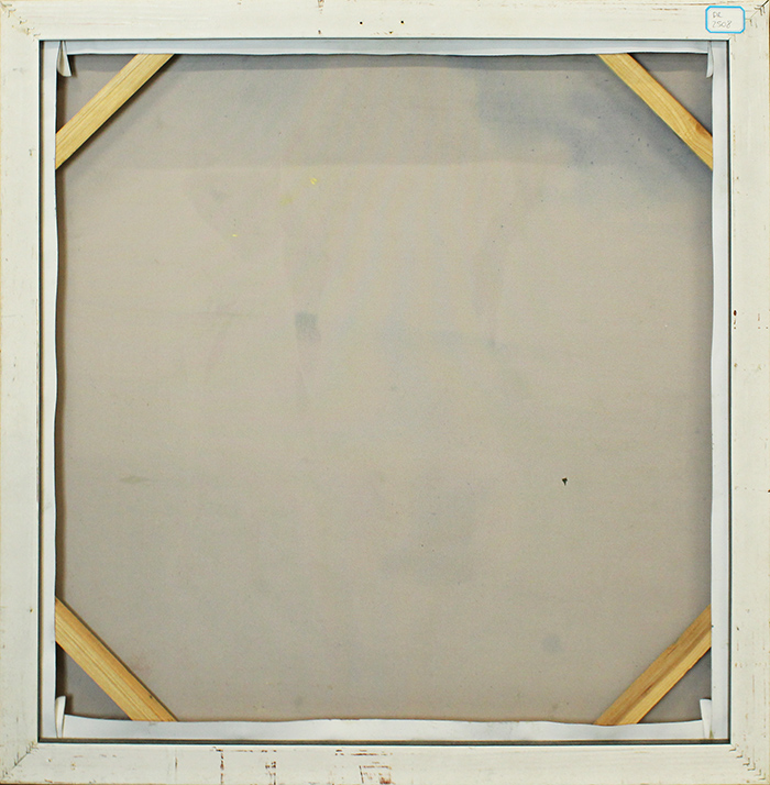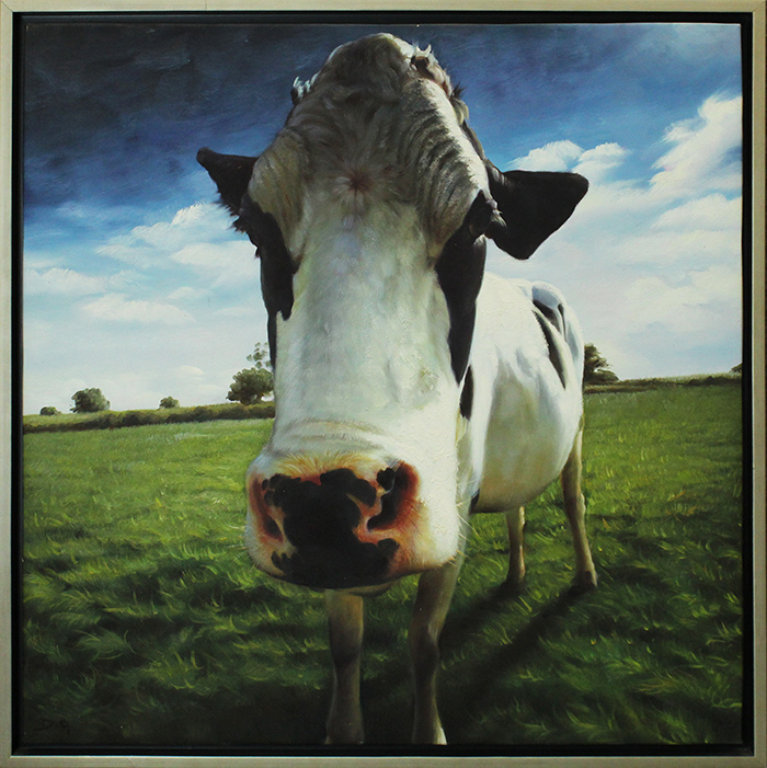 DA, "Mucca realistica nell'erba" anni 2000, olio su tela, cm 70x70, con cornice cm 74x74x4, kg 2,60.