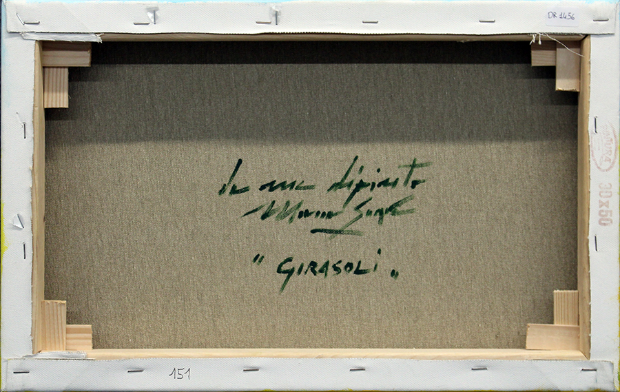 MARIO SOAVE, "Girasoli", anni 2000, olio su tela, dim 30x50. Al verso: dichiarazione di autenticità da parte dell'artista, firma, titolo.