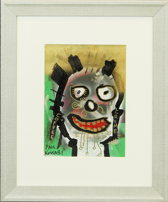 PAUL KOSTABI, "Coffee Crime", 2011, tecnica mista su carta, dim. cm 33x23, con cornice cm 58x48x2, peso kg 2,10. Opera con autentica e certificato di provenienza Daliano Ribani Arte. Opera con cornice.