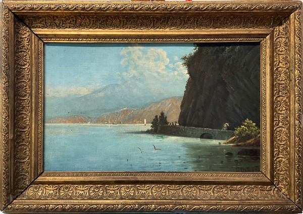 Giuseppe De Rubelli "Veduta di Mandello, Lago di Lecco" olio su tela (cm 23,5x3