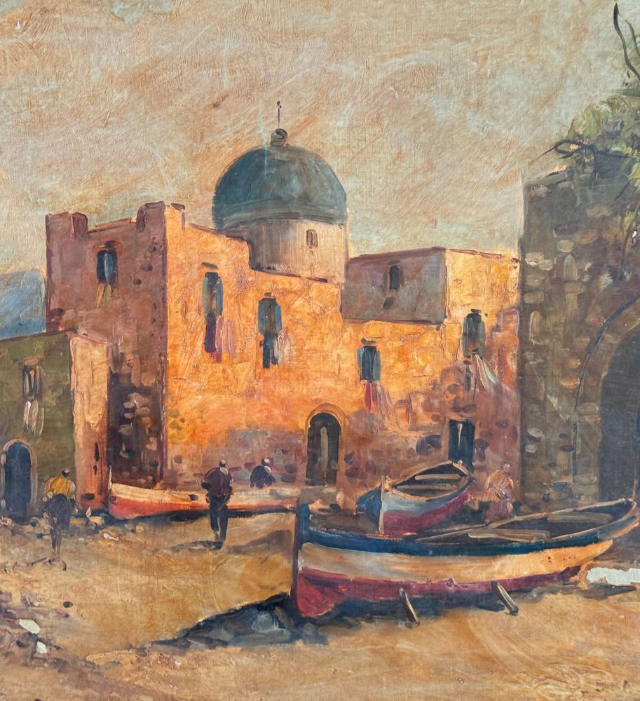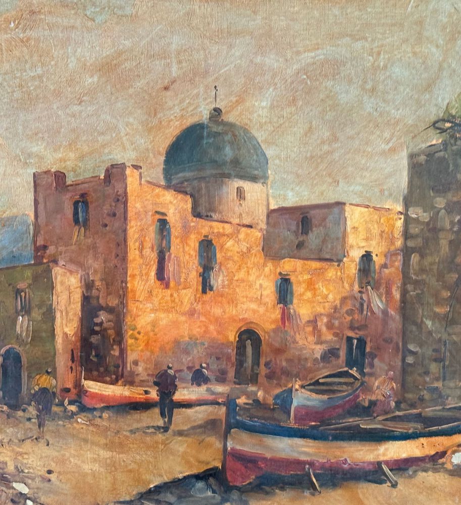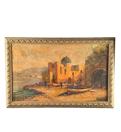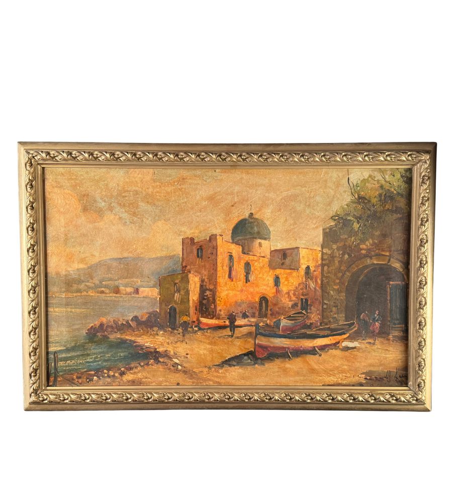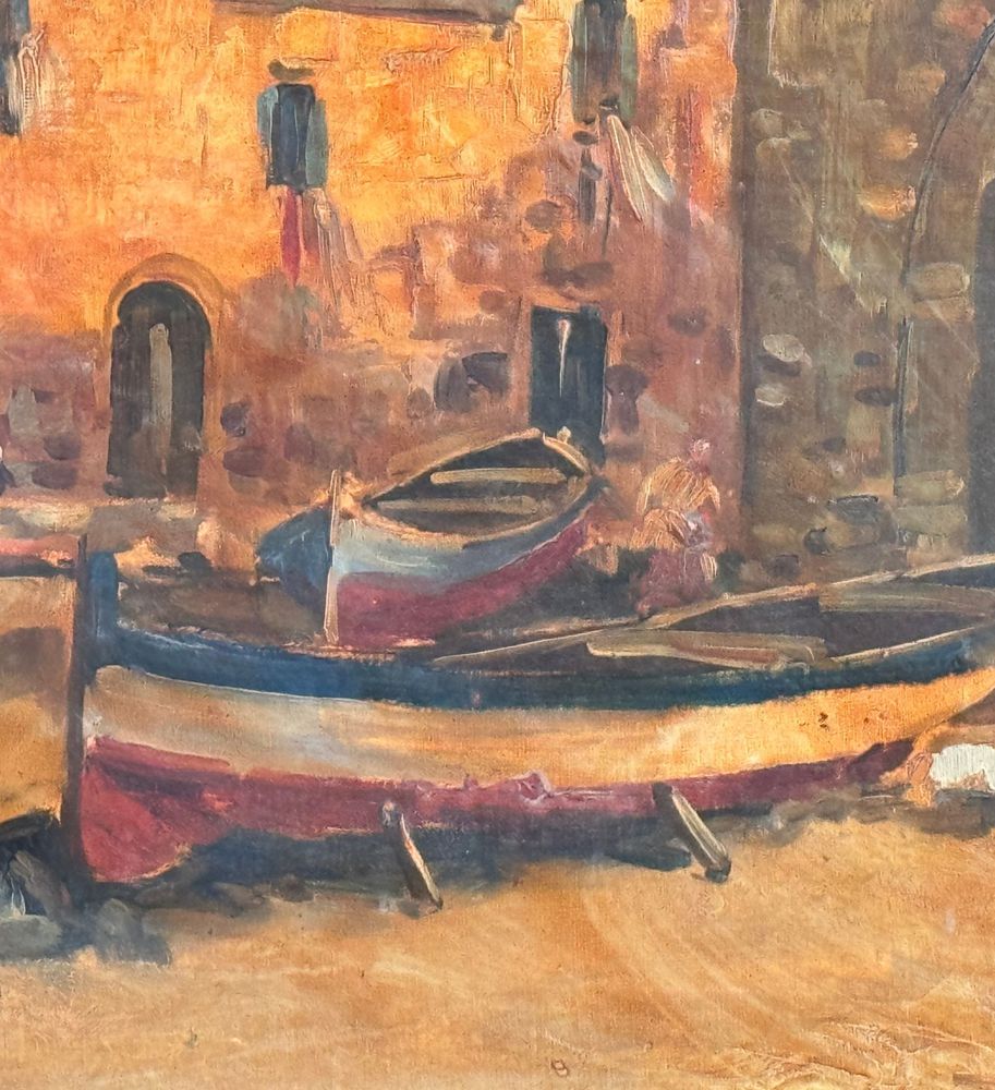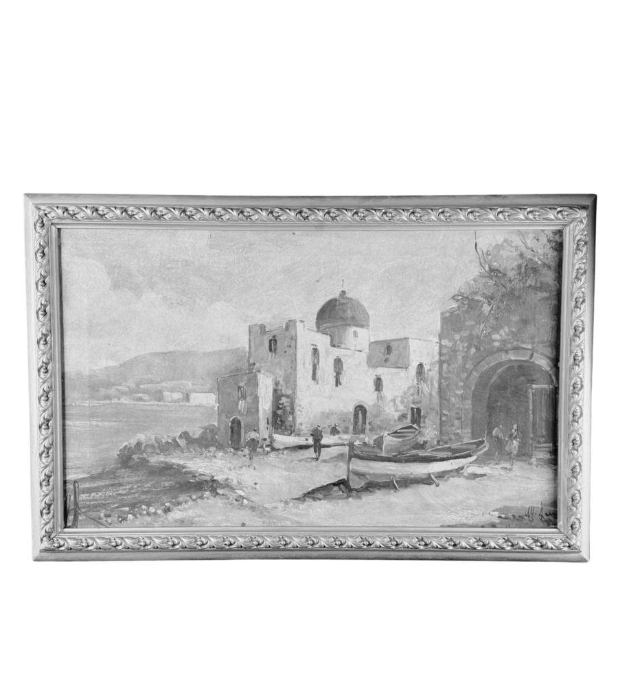 Dipinto olio su tela, periodo XX secolo scuola Italiana, raffigurante Scorcio di marina con barche. Dimensioni compreso cornice: 93x60 cm. Dimensioni interno cornice: 82x50 cm. Reca firma in basso a destra da artista non identificato. Opera in buone condizioni con segni di vissuto come da foto allegate.