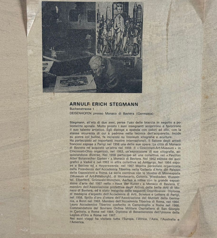 Tecnica acquerello e acrilico su cartoncino, periodo XX secolo scuola Europea, raffigurante Personaggi a Venezia. Dimensioni compreso cornice: 62x47 cm. Dimensioni interno cornice: 48x33 cm. Reca firma in basso a destra da Arnulf Erich Stegmann. Opera in buone condizioni.