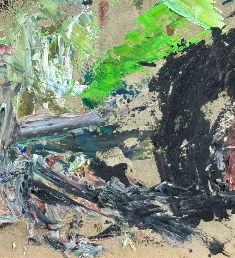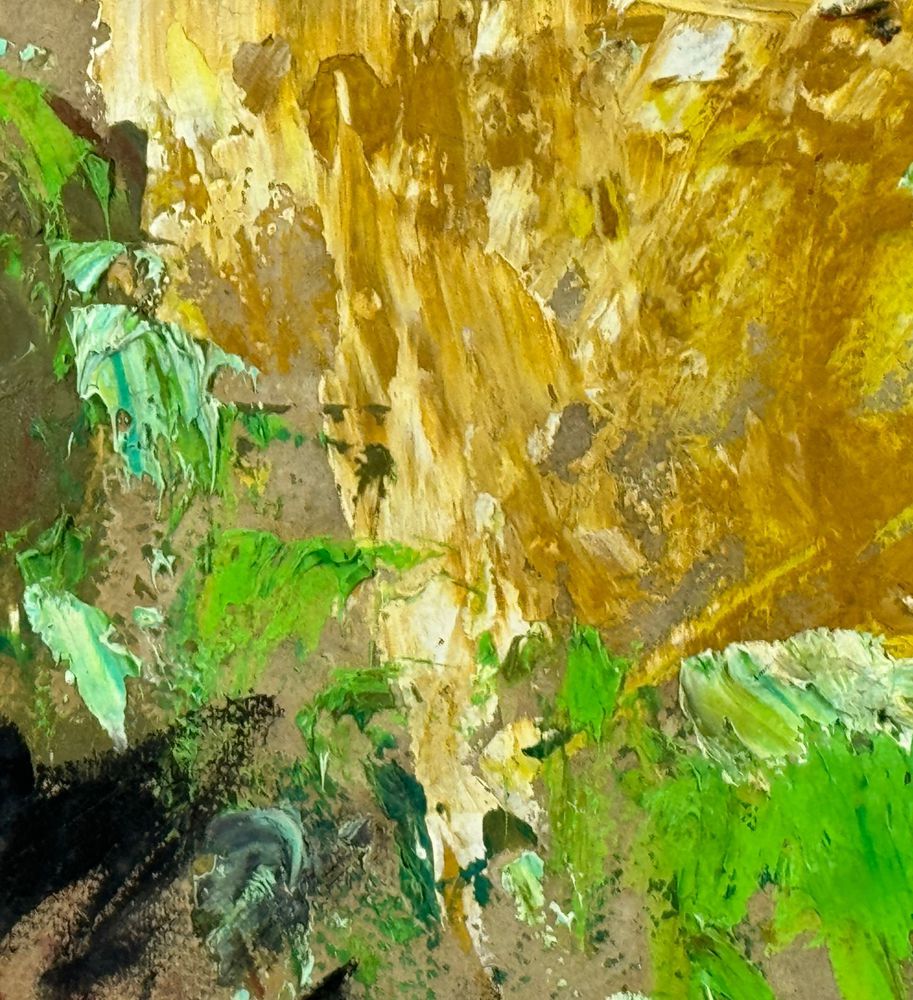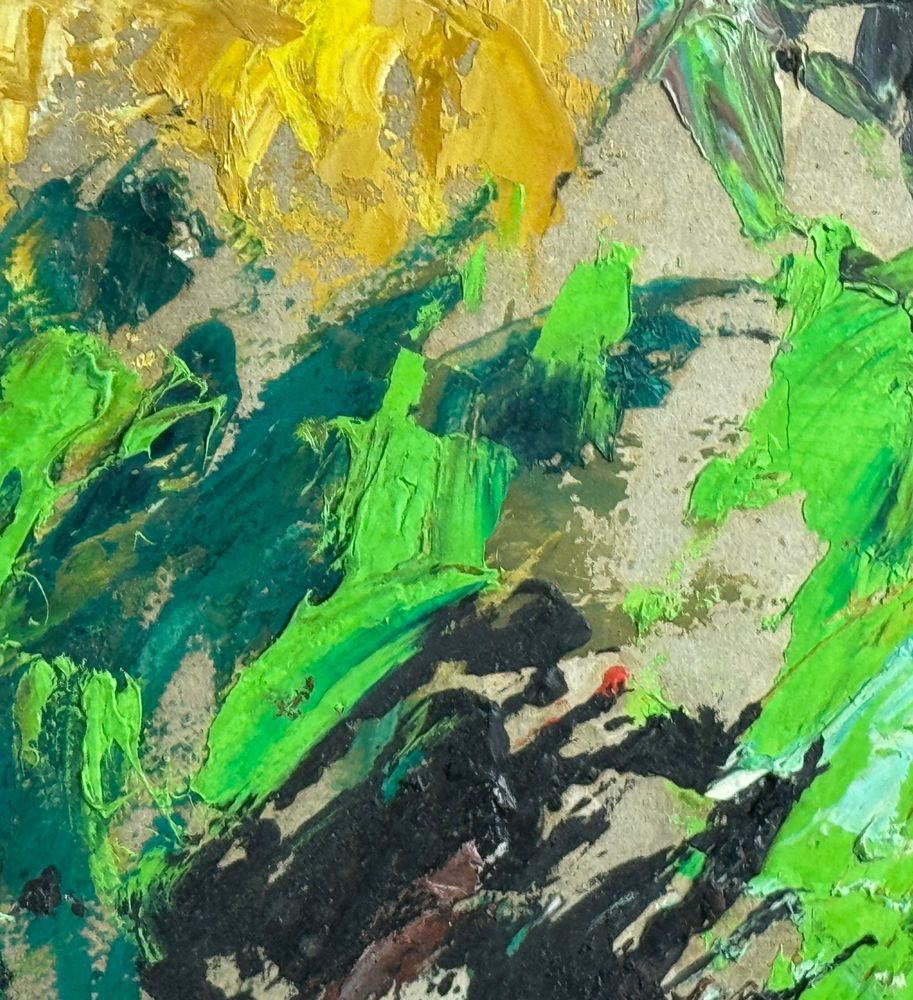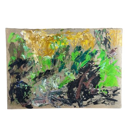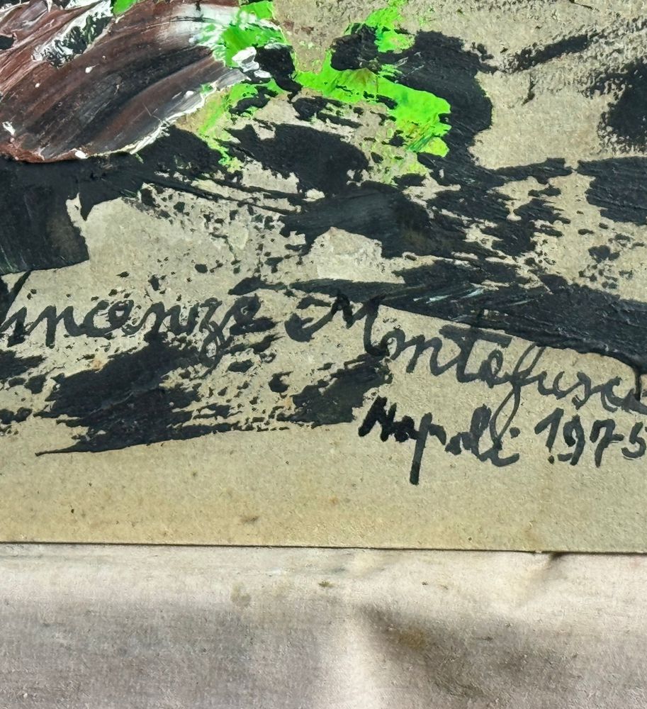 Dipinto olio su pannello, periodo XX secolo scuola Italiana, raffigurante Prova di colori. Dimensioni: 71,5x50 cm. Reca firma in basso a destra da Vincenzo Montefusco 1975. Opera in buone condizioni.