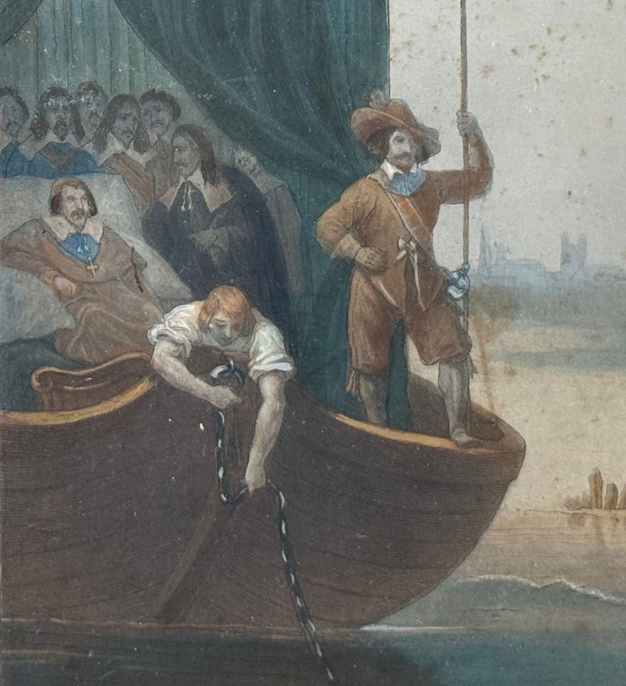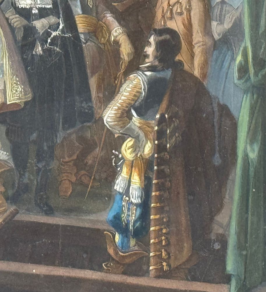 Dipinto tecnica acquatinta colorata, periodo XIX secolo scuola Francese, raffigurante Cospirazione di Cinq-Mars. Dimensioni compreso cornice: 75x91 cm. Dimensioni interno cornice: 44x57 cm. Da artista anonimo. Opera in discrete condizioni come da foto allegate.