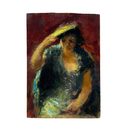 Dipinto olio su pannello, periodo XX secolo scuola Italiana, raffigurante Donna con cappello nella maniera impressionista. Dimensioni: 20x14 cm. Da artista anonimo. Opera in buone condizioni.