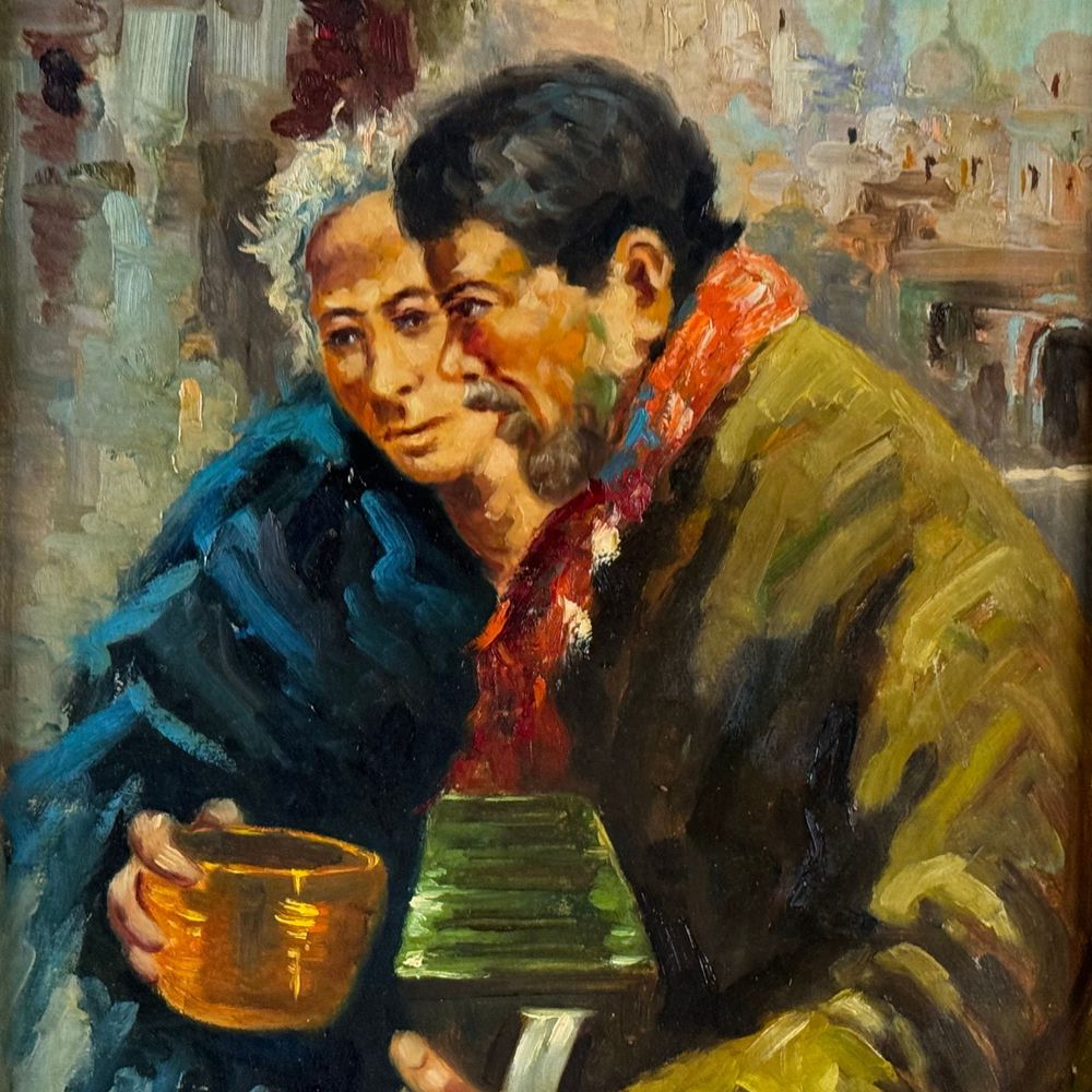 Dipinto olio su tela, periodo XX secolo scuola Italiana, raffigurante Due personaggi. Dimensioni interno cornice: 50x70 cm. Dimensioni compreso cornice: 67x87 cm. Reca firma in basso a destra da artista non identificato. Opera in buone condizioni.