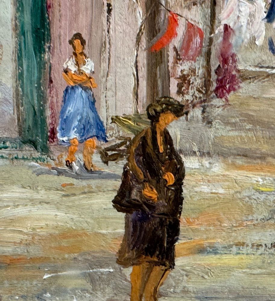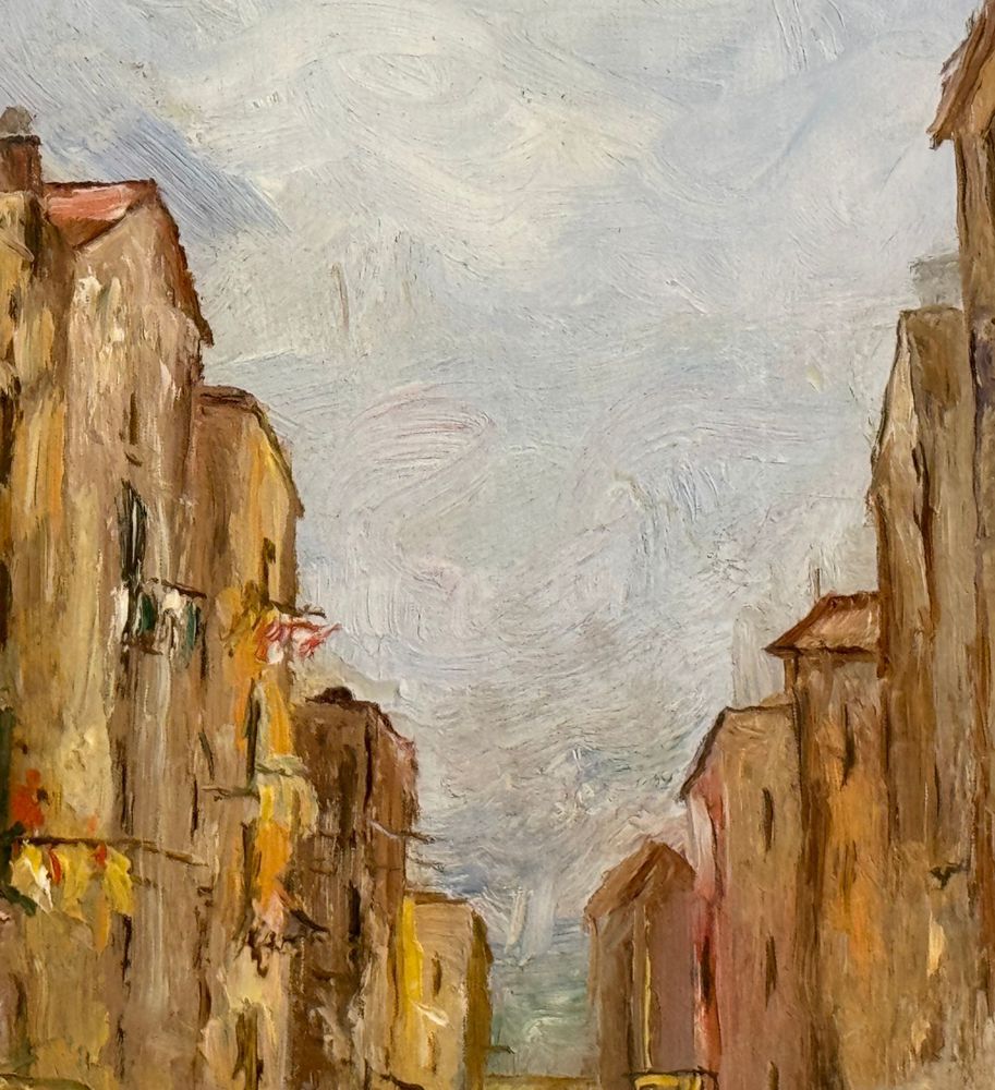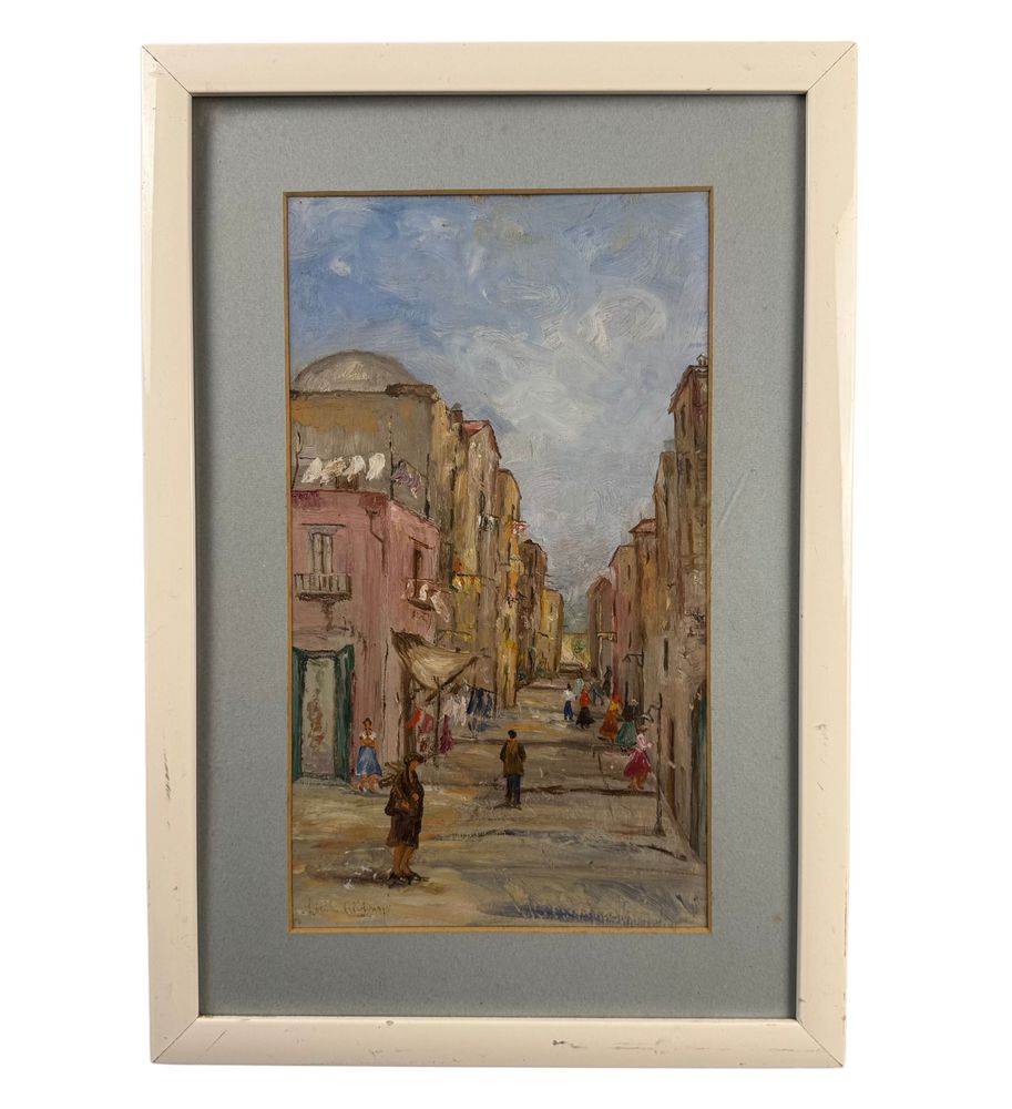Dipinto olio su tavola, periodo XX secolo scuola Italiana, raffigurante Strada con personaggi. Dimensioni compreso cornice: 34x50 cm. Dimensioni interno cornice: 22x37 cm. Reca firma in basso a sinistra da artista non identificato. Opera in buone condizioni.