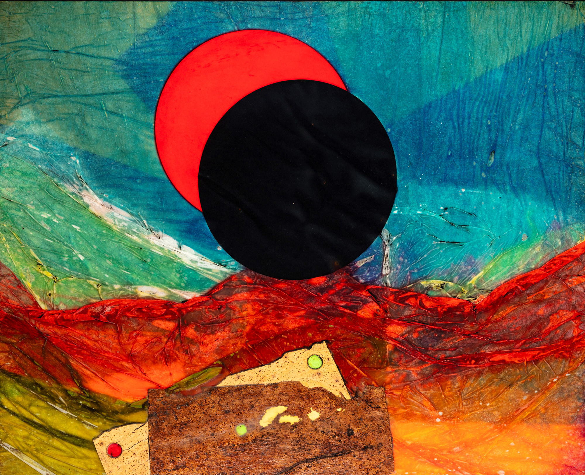 tecnica mista, collage e sughero su tavola