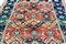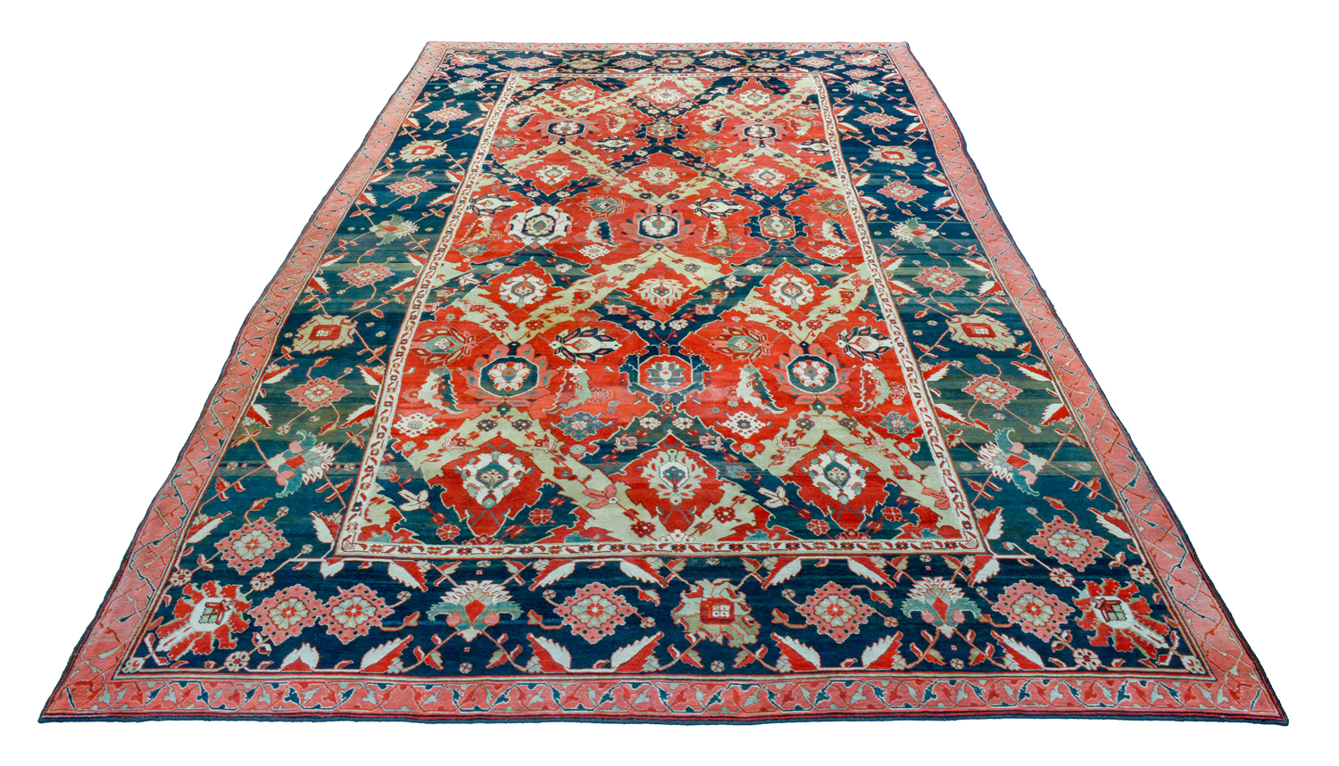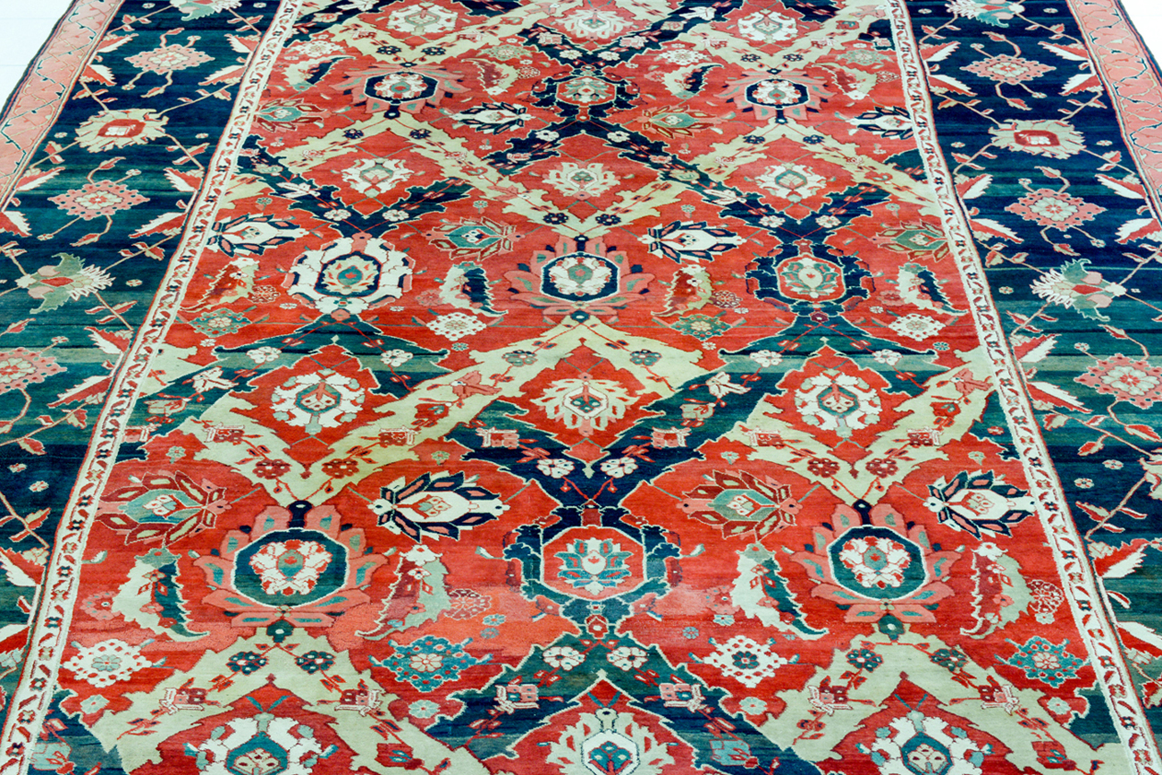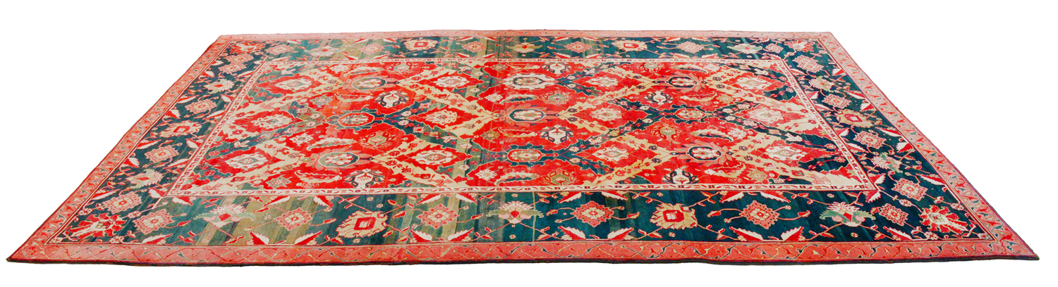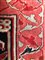 Numerosi abraches, visibili soprattutto nella bordura, che mostrano l’integrazione dei cambi di lana in tessitura. L’impianto decorativo riprende quello degli antichi tappeti caucasici detti a draghi, qui stilizzati nelle foglie disposte a griglia. È possibile che l’esemplare sia stato prodotto in una prigione britannica in India, durante il periodo coloniale.