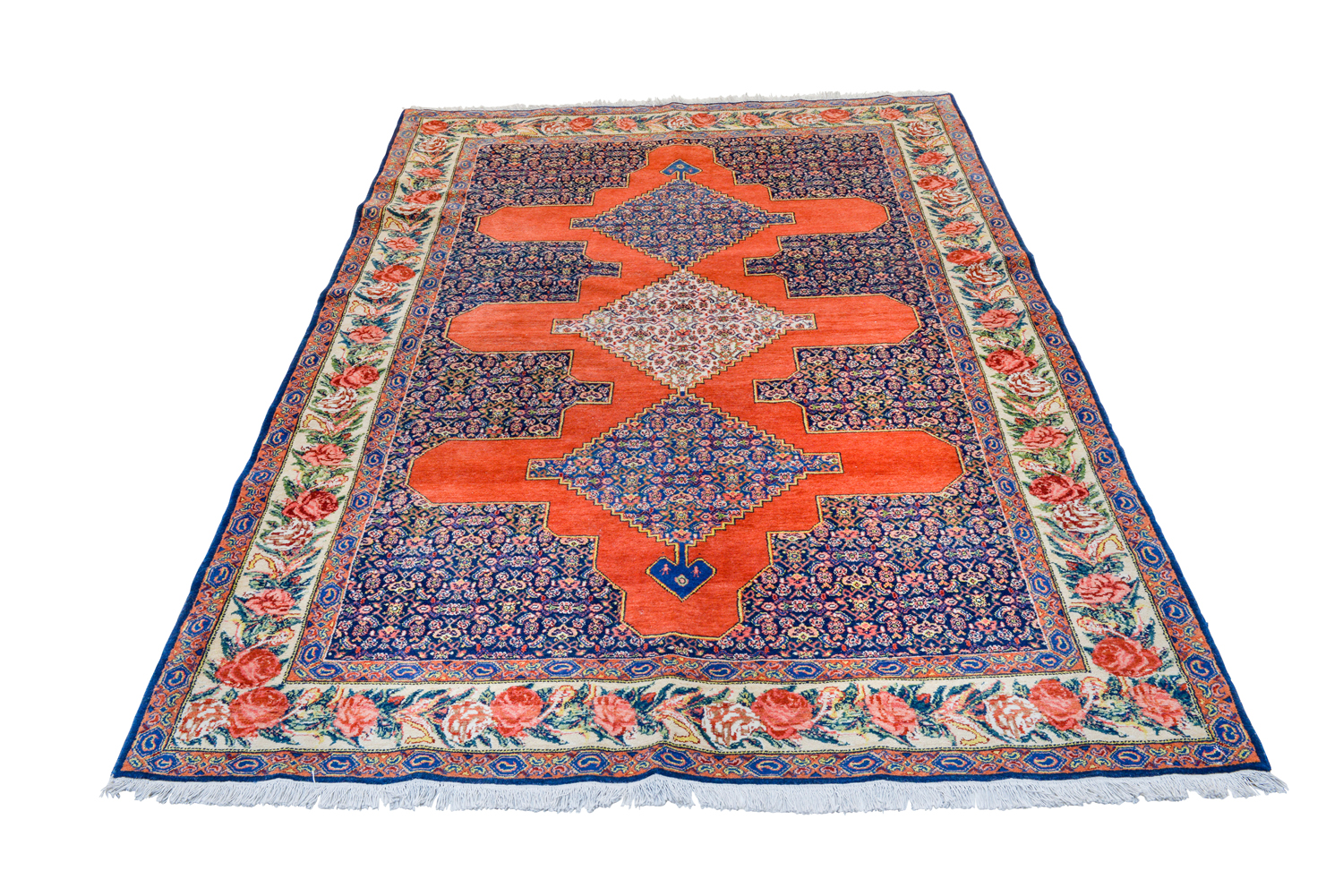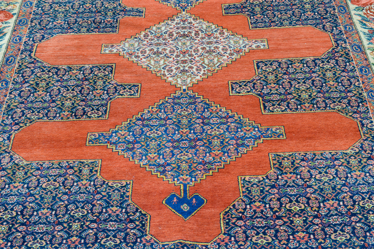 Il campo presenta il caratteristico motivo herati molto fitto dei tappeti Senneh. Si noti l’inserimento di quattro piccole figurine antropomorfe. Tale impianto geometrico contrasta con la bordura decorata a rose di tipo occidentale, cosiddette gol farang, o rosa francese.