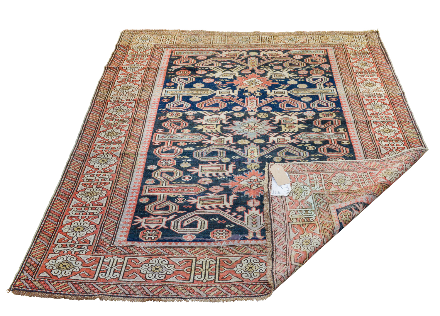 Classico esemplare con disegno a corna di montone su fondo blu e bordura pseudo cufica a fondo rosso, contraddistinta da un evidente abrash nella parte alta.