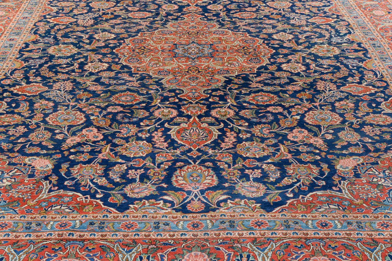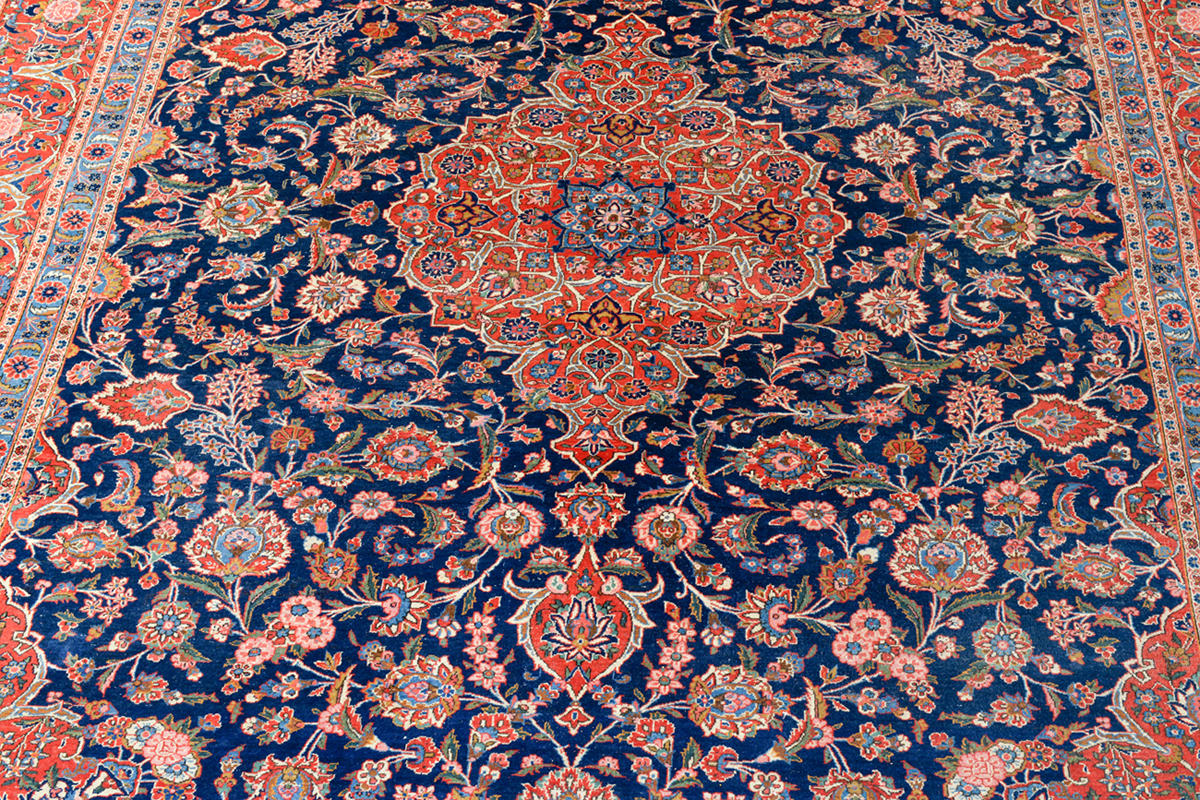 Classico esemplare con piccolo medaglione allungato in rosso, contenente al centro una stella azzurra, con due pendenti, appoggiato sul campo di colore blu riccamente decorato con motivi floreali. Bordura a fondo rosso, con tipiche rose di Kashan, alternate a foglie biforcute.