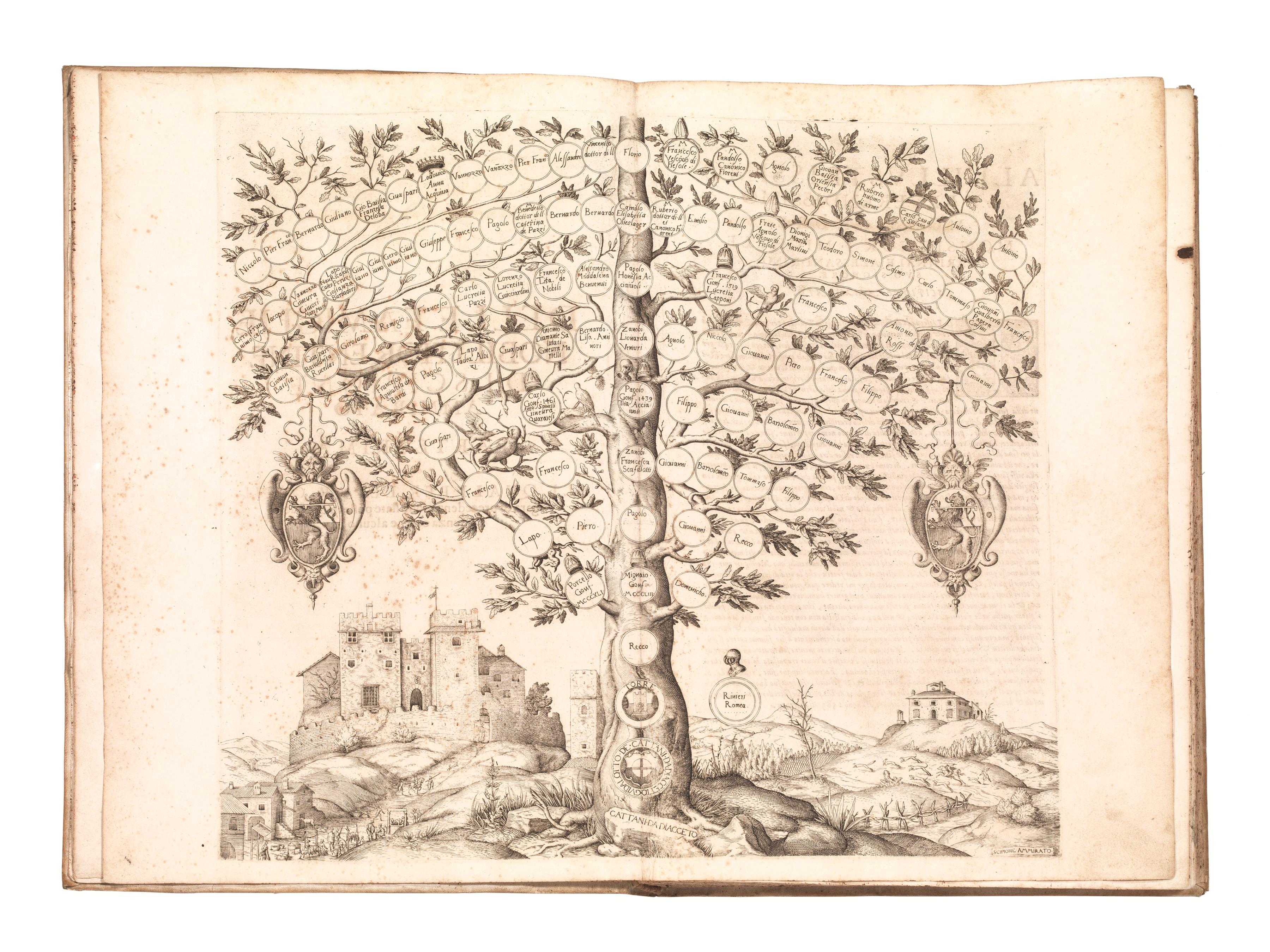 In folio (420 x 271 mm). [iv] 212 [8] pp. Ampio stemma calcografico dei Medici al frontespizio, marca tipografica al verso dell’ultima carta. Illustrato da 13 tavole calcografiche raffiguranti alberi genealogici (3 ripiegate, 6 a doppia pagina, e 4 a piena pagina). Piena pergamena coeva semirigida con titolo manoscritto al dorso, tagli spruzzati. Una delle tavole ripiegate ha il margine inferiore rifilato e anticamente restaurato al retro, uno strappo, e il margine destro un po’ sfrangiato nella parte bianca; un paio di tavole un po’ ingrigite, due quaderni bruniti, occasionali fioriture e tracce del tempo, ma nel complesso una buona copia.