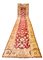 Il tappeto si sviluppa con una serie di palmette incolonnate sull’asse centrale, accompagnate da foglie arcuate. Lo stesso motivo si ripete nella bordura che però risulta essere originale soltanto nella parte sinistra. La bordura di destra è completamente ritessuta, il che induce a pensare che il tappeto in origine avesse formato completamente diverso e non di corsia.