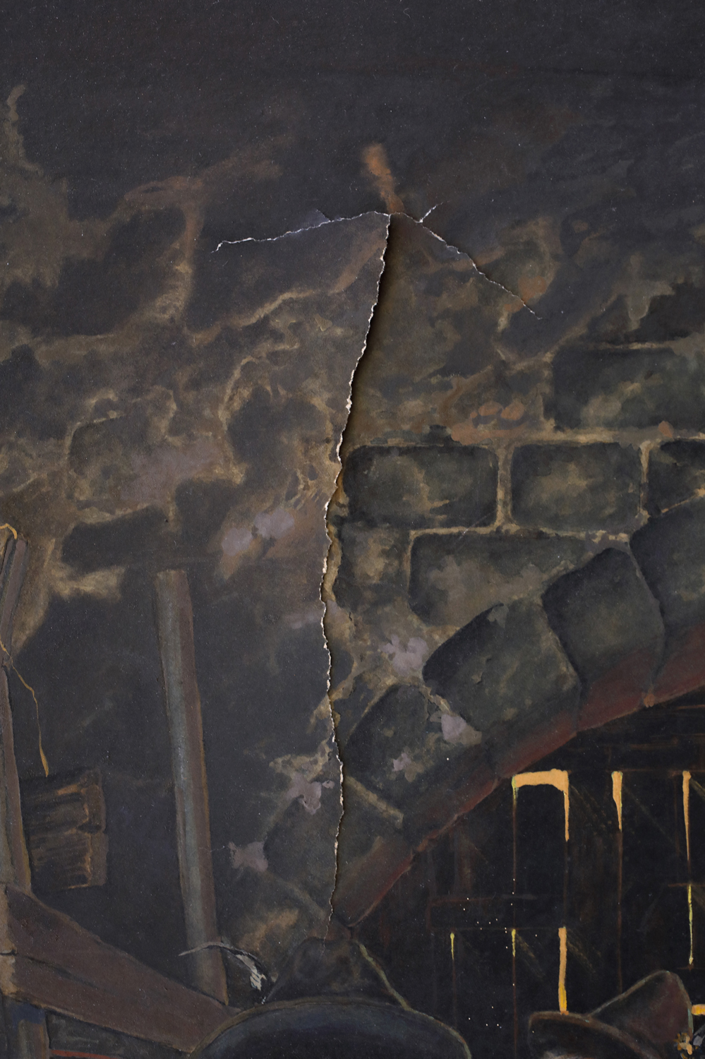 Stato di conservazione. Supporto: 70% (sfondamenti e strappi riallineati, di cui almeno 5 risarciti e altri aperti)