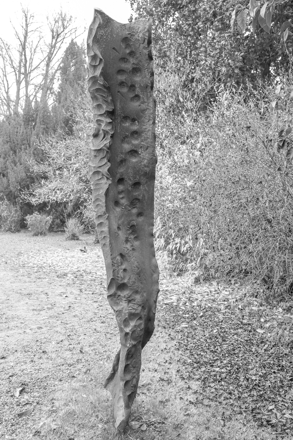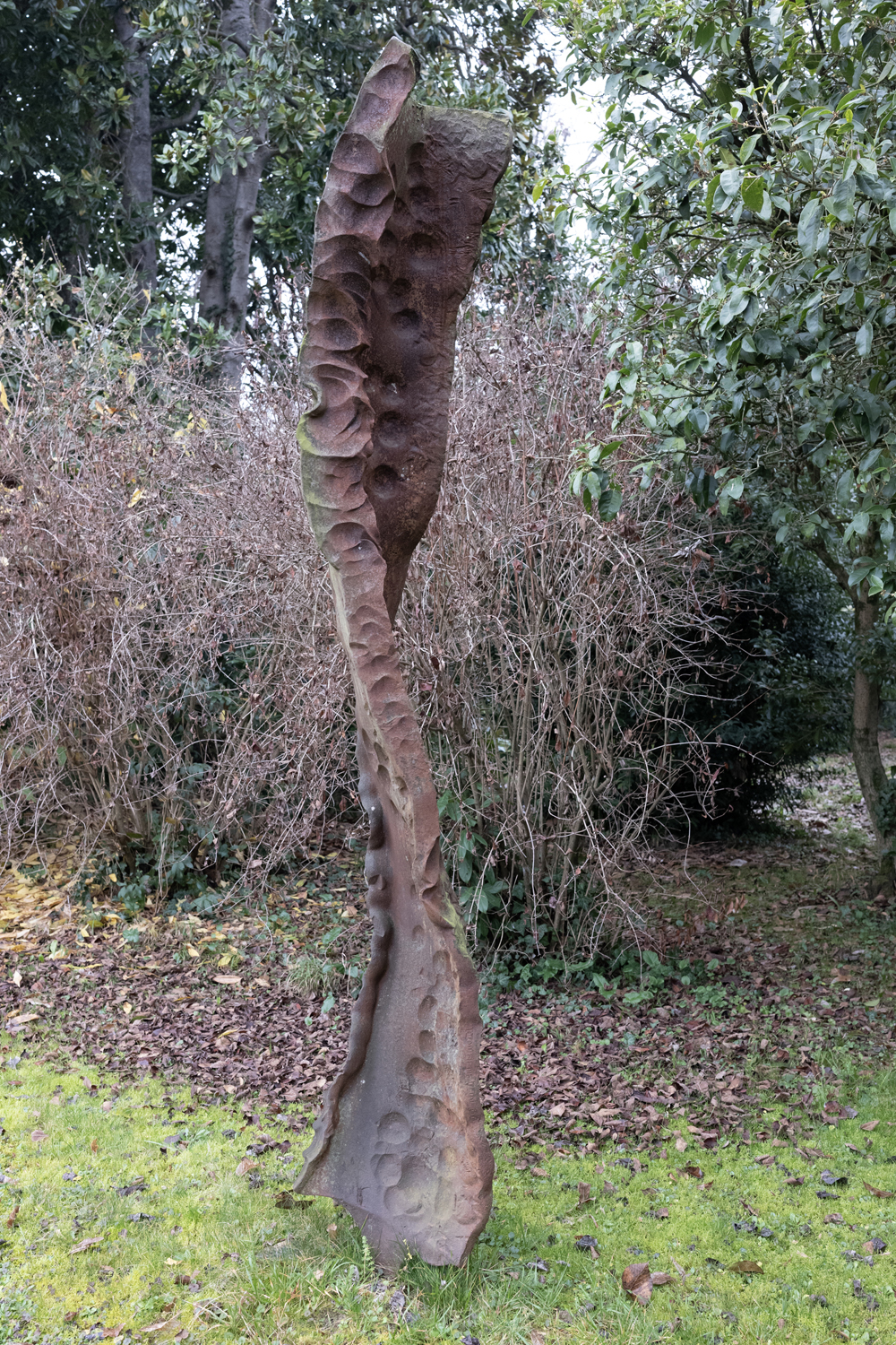 Osservando questa immagine si ha l’impressione di una lastra in rapido cammino verso di noi. L'osservazione dei tagli laterali mostra una stupefacente successione di segni che richiamano la leggerezza e le grinze del tessuto di tulle. In altra prospettiva, d'altra parte, le grandi superfici ricordano la luna, modellata dai meteoriti o il corpo di un pugile che barcolla crivellato di pugni. "Forma plastica n. 1" è la più grande scultura di questa serie, sviluppata negli anni Sessanta, in cui la rigidità del metallo cede alla forza del calore e del maglio assumendo una forma viva, esito di un combattimento non tanto tra il metallo e lo scultore quanto tra la lastra e il calore, che qui Benetton lascia protagonista nella creazione della forma finale.