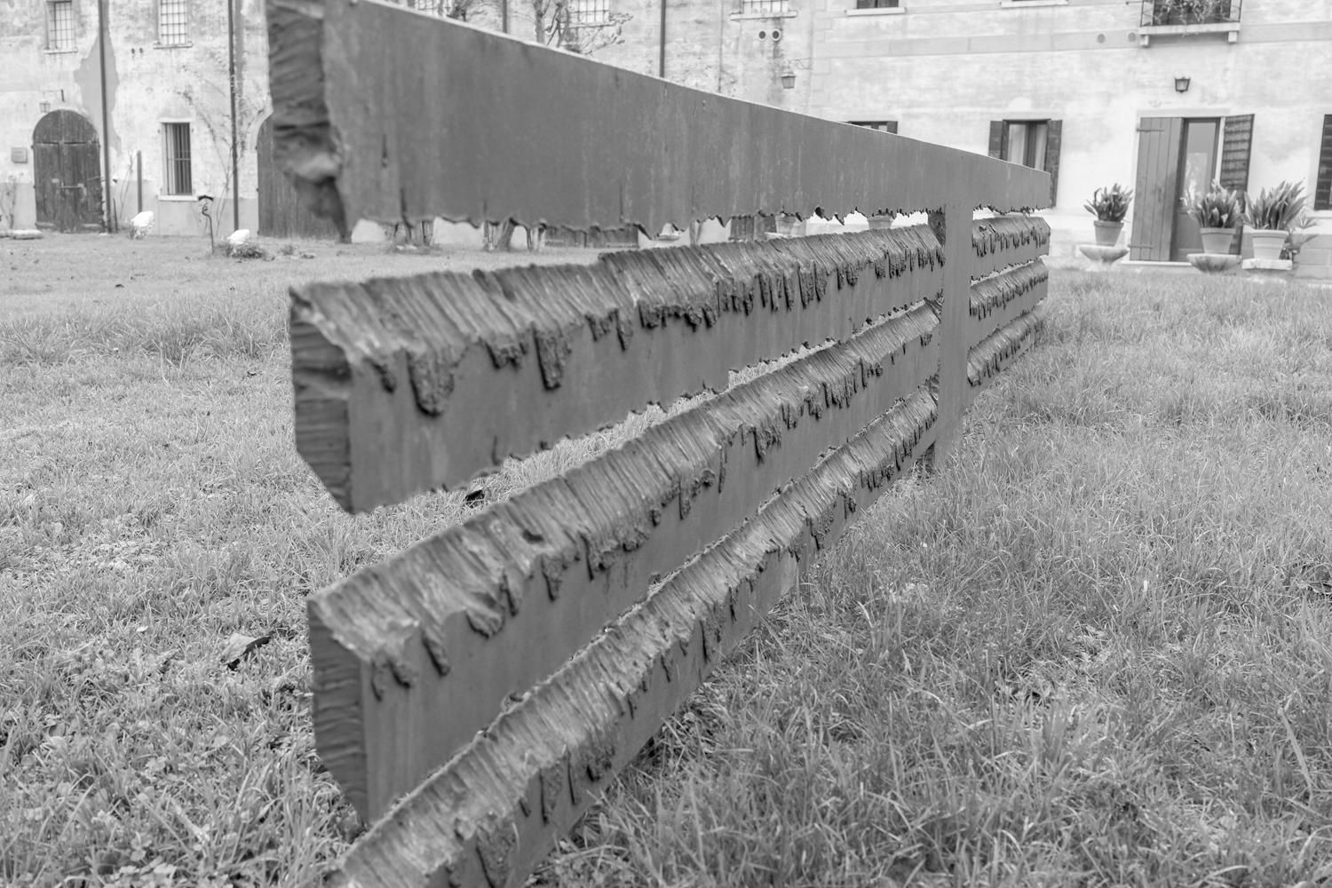 Proprio la patinatura in argento dei tagli - lasciati da Benetton al vivo anche con i residui di fusione - fa intendere che il tema fondamentale è il passaggio della luce attraverso il ferro.