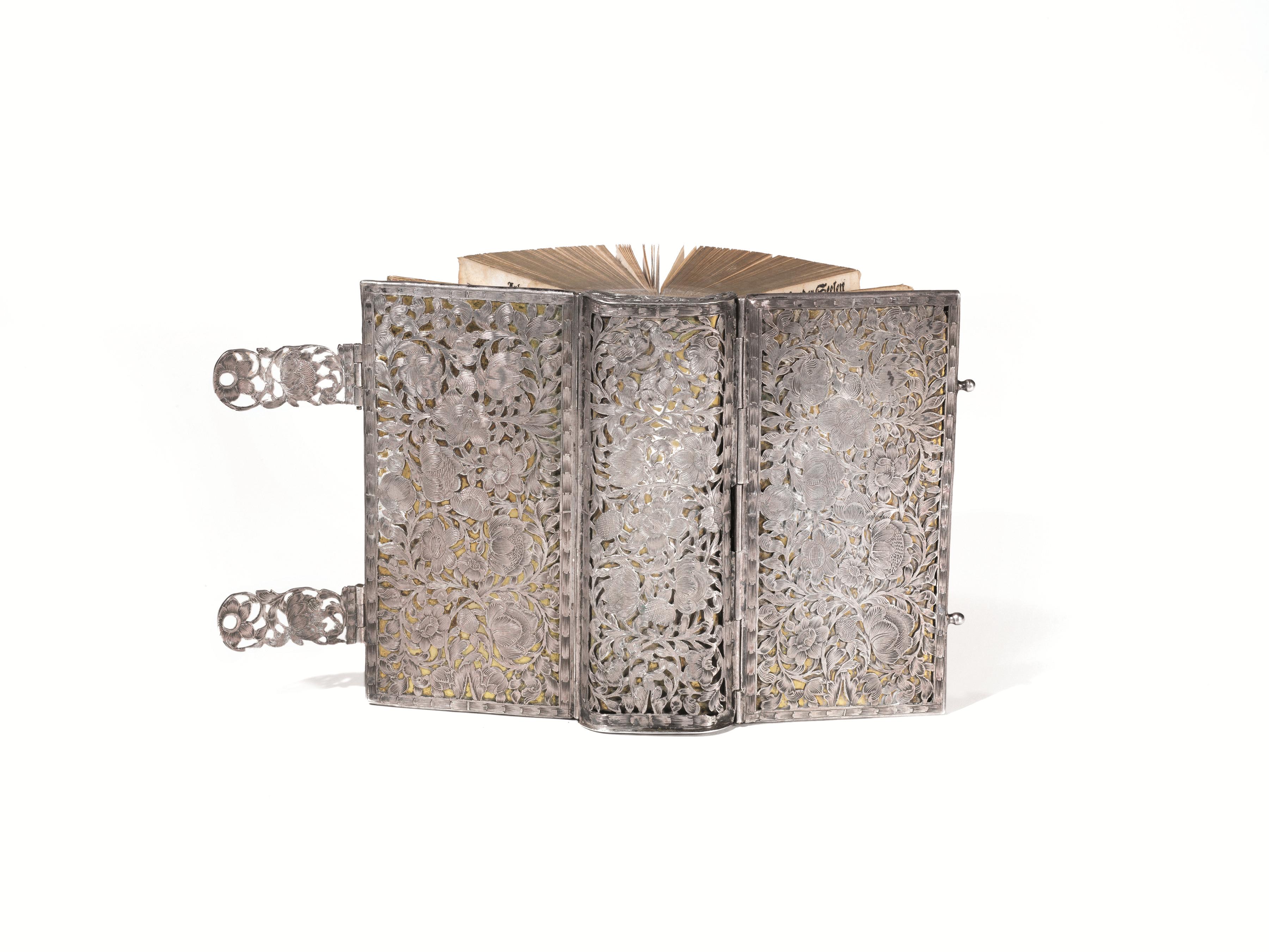 in gotico. Legatura in argento, cesellata con motivi floreali ai piatti, al