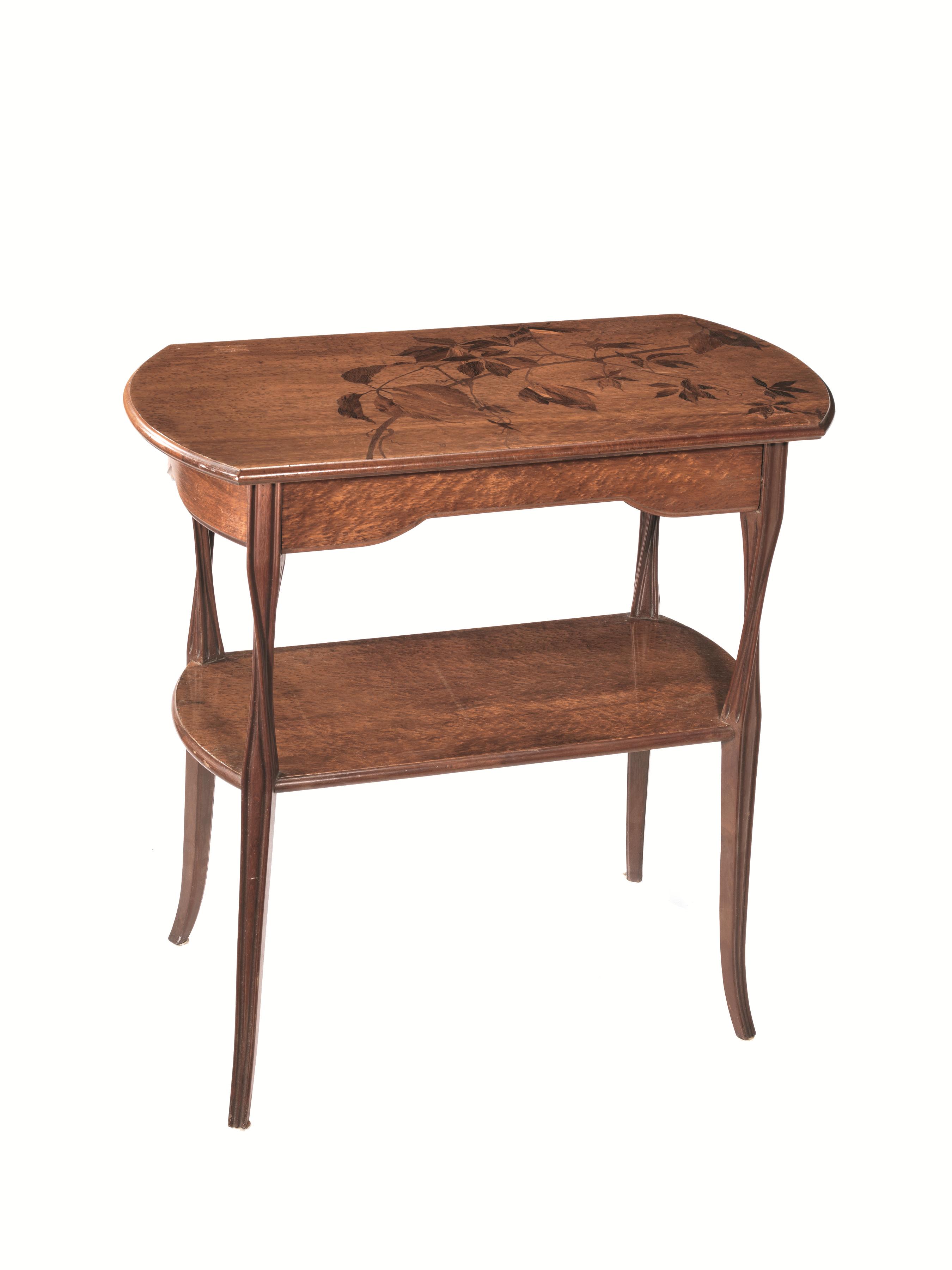 in legno di noce, piano superiore intarsiato in legni di frutto a motivo di tralci fogliati, gambe scanalate con movimento a torchon. Firma sul piano L. Majorelle Nancy, cm 77x63x51