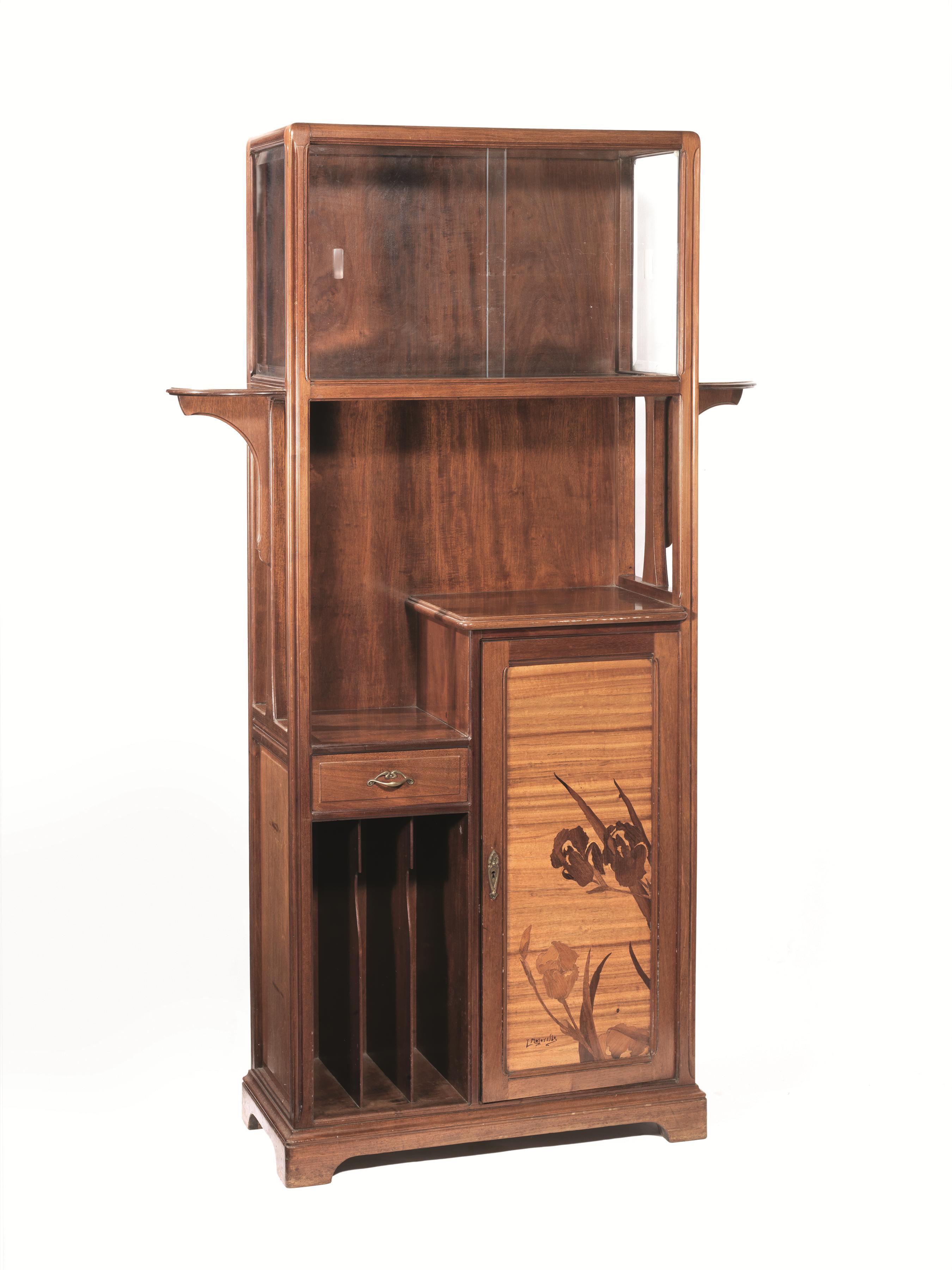 in legno di noce con intarsi in legno di frutto. Parte superiore con vetri scorrevoli e due mensole laterali semicircolari, un cassetto e un vano portariviste nella parte inferiore, affiancati da un’anta intarsiata con foglie e fiori. Firma intarsiata sull’anta L. Majorelle, cm 160x95x31