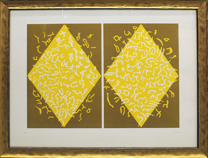 CARLA ACCARDI, "Segni", 2001, incisione all'acquatinta su cartoncino, cm 56x76, con cornice 62x82,5x3 cm, 4 kg, esemplare 37/70. Al fronte: tiratura in basso a sinistra, firma e timbro in basso a destra. romani e alcune prove d'autore. Al fronte in basso a sinistra esemplare 167/300 e in basso a destra firma. Al verso: informazioni e tiratura in basso a sinistra. Opera con certificato di provenienza della Daliano Ribani Arte. Opera con cornice in omaggio.