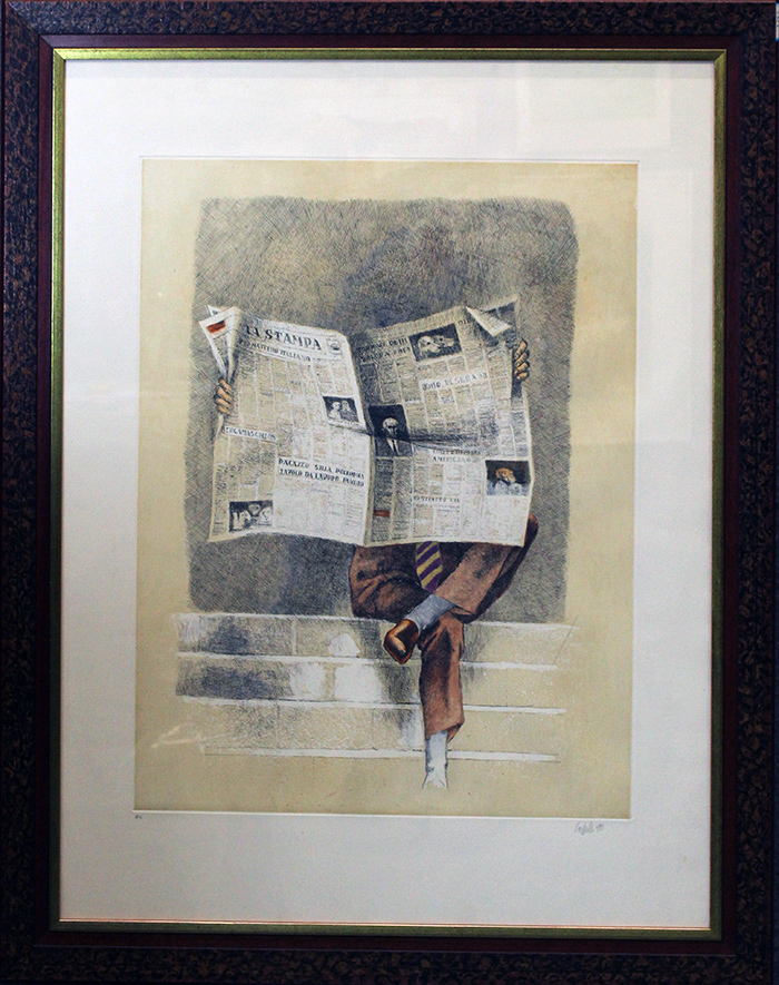 GIOVANNI CAPPELLI, "Uomo con il giornale", 1990, Litografia pastellata, cm 65x85, con cornice 97x75x2,5 kg 4,60. Esemplare P.A. in basso a sinistra firma a mano in basso a destra. Opera con certificato Daliano Ribani Arte.