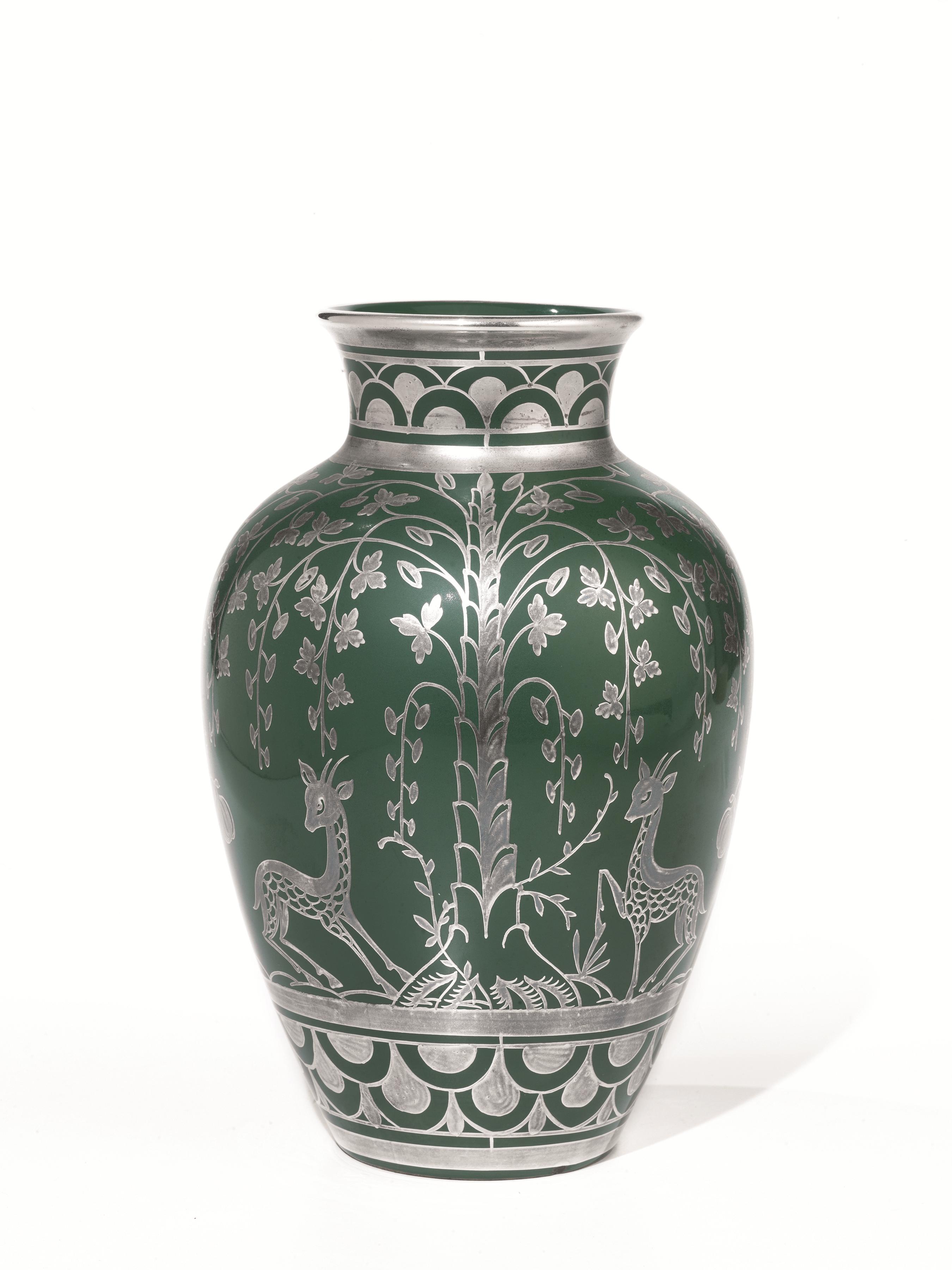 porcellana verde con decoro in argento. Sul fondo Richard Ginori M1672 450 E, alt. cm 22