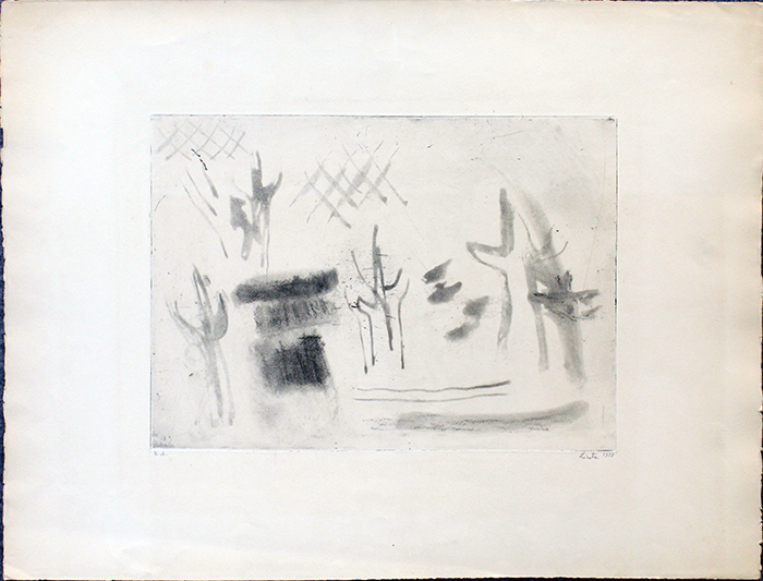 RICCARDO LICATA, "Segni", 1958, incisione su cartoncino, cm 50x66. Al fronte: firma e anno in basso a destra, tiratura in basso a sinistra E/A. Presenta leggero ingiallimento dovuto al tempo. Opera senza cornice.