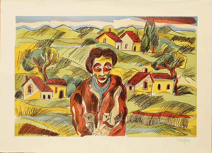 GIUSEPPE SERAFINI, "Uomo e campagna", anni '70, litografia su cartoncino, 50x70 cm, esemplare VII/XXX. Al fronte: tiratura in basso a sinistra e firma in basso a destra. Opera con certificato di provenienza della Daliano Ribani Arte. Opera senza cornice.