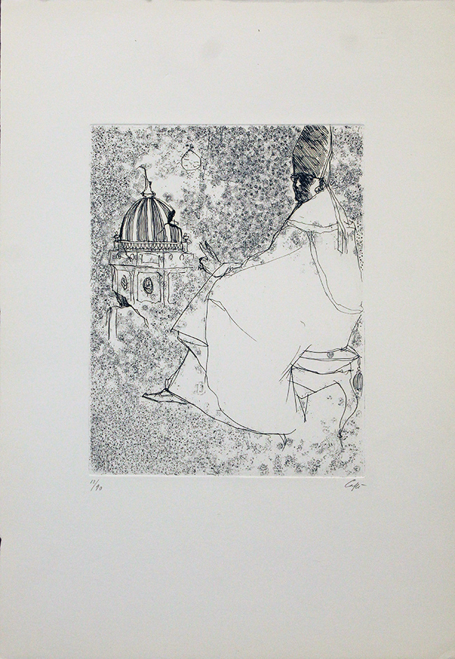 NINO CAFFE', "Vescovo seduto", 1973, cofanetto con note biografie e incisione all'acquaforte in bianco e nero su cartoncino, la lastra misura 26,5x20 cm, tutto il foglio 50x35 cm, esemplare 12/90. Al fronte: esemplare in basso a sinistra e firma in basso a destra. Opera con certificato del Centro di Studi per l'incisione del club del collezionista di stampe. Opera con certificato di provenienza della Daliano Ribani Arte. Opera senza cornice.