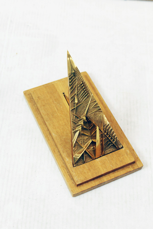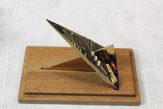 ARNALDO POMODORO, "Medaglia per aeroporto di Genova", 1994, medaglia in bronzo dorato cm 8,5x9x6. Firma e numerazione (Esemplare 37/400) incise alla base. Note: Opera realizzata presso lo Stabilimento Stefano Johnson, Milano, in 400 esemplari in numeri arabi + prove d'artista, Edizioni Galleria Cesarea, Genova. L'opera è corredata dal suo contenitore in legno: Marigo-Genova e dal delizioso Catalogo edito da De Ferrari Editore, Genova e con testo critico di Luciano Caprile. In fondo al catalogo è presente il certificato di origine della Galleria d'Arte Cesarea, Genova con tiratura.