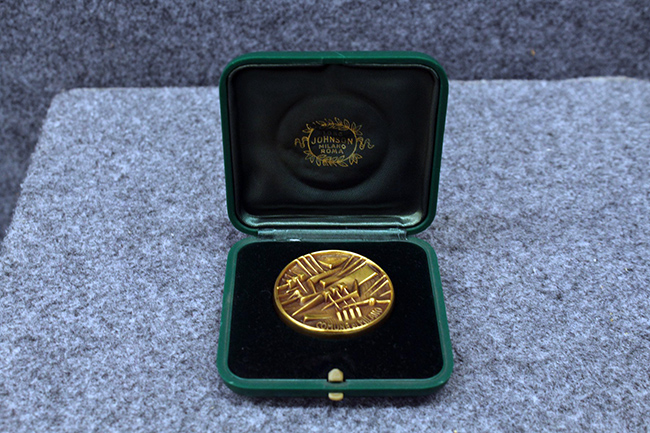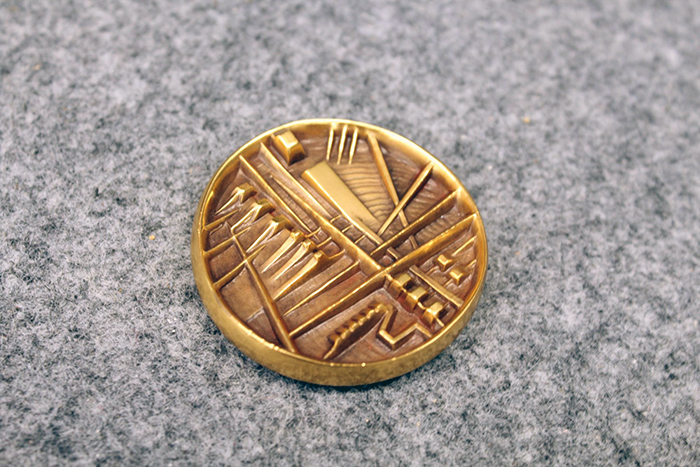 ARNALDO POMODORO, Fine anni '70. Nel centro raffigurazione astratta. In piccolo: firma A. Pomodoro. Al verso: Nel campo raffigurazione astratta. (Stabilimento S. Johnson). Diam. mm. circa 69,04. Con astuccio originale Johnson.