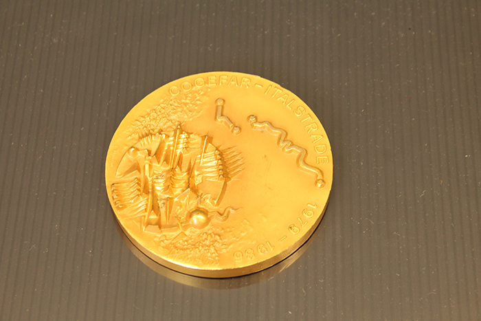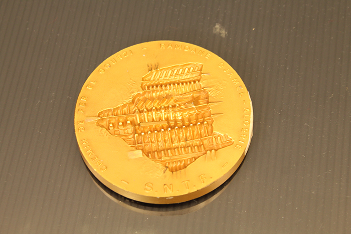 ARNALDO POMODORO, "Cogefar", 1986, medaglia in bronzo dorato, cm 8x8x1, edizione Johnson (MI), la medaglia è stata realizzata a ricordo della costruzione della ferrovia "El Gourzi" in Algeria. Realizzata in 500 esemplari + prove d'artista.