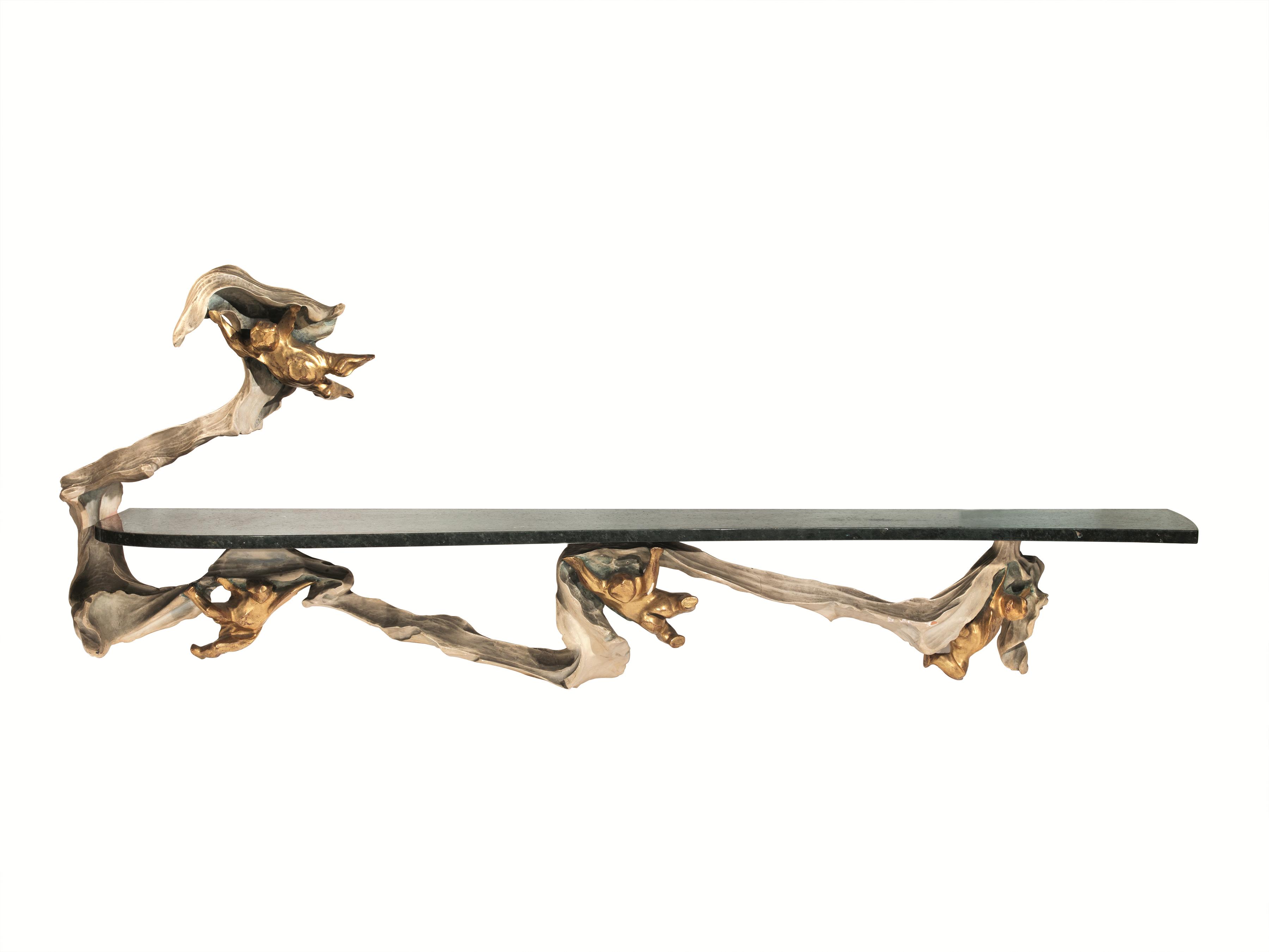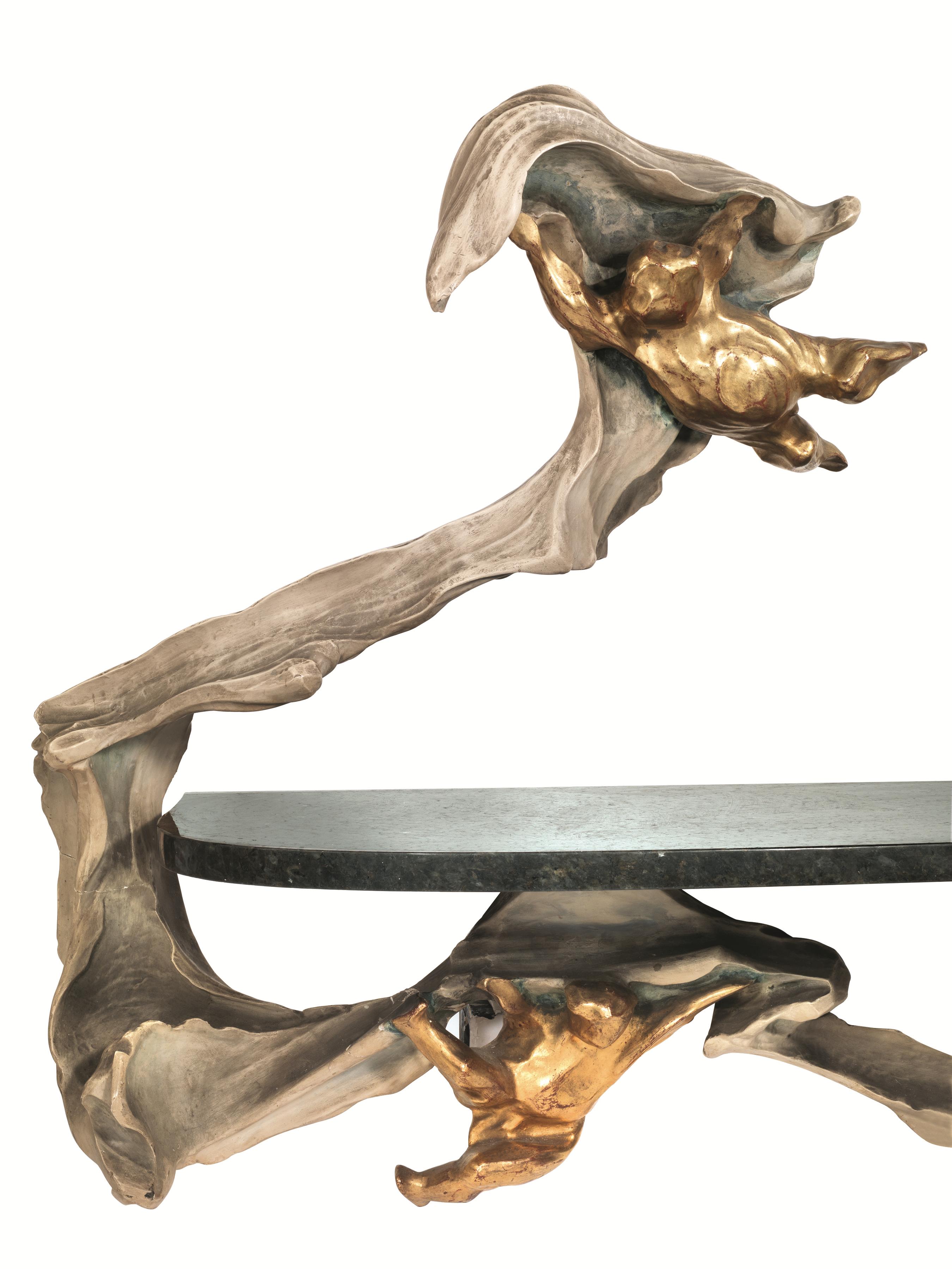 legno scolpito, laccato e dorato, piano in marmo verde,