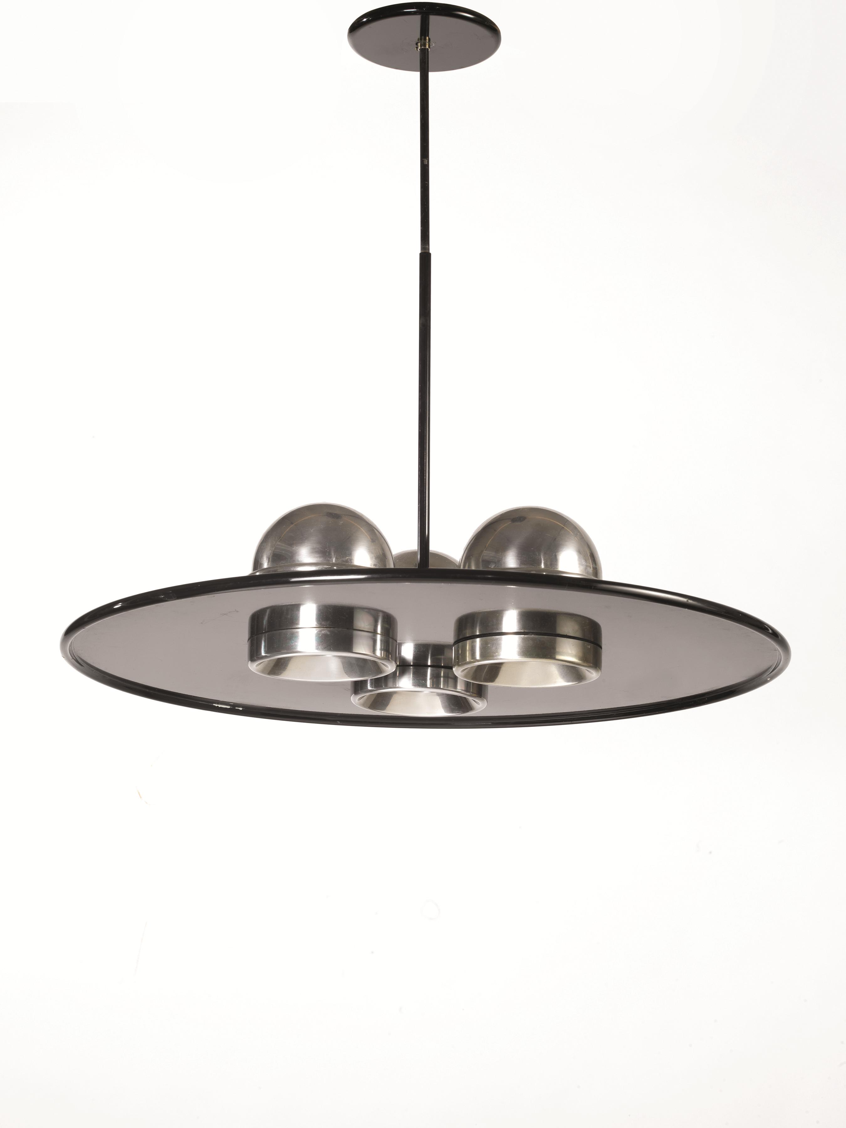 lampada a sospensione in acciaio e alluminio laccato nero a tre luci, marca impressa Stilnovo Made in Italy, alt. cm 110, diam. cm 76, difetti alla verniciatura