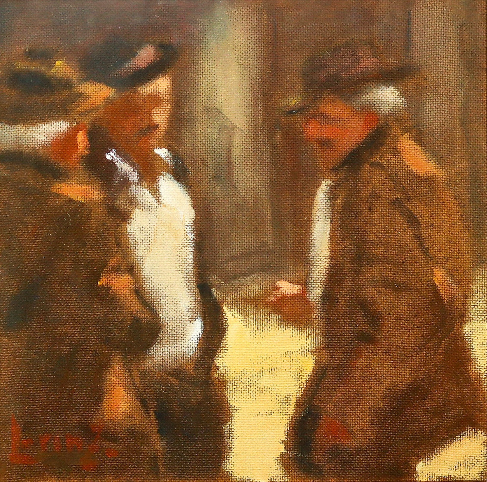 Albino Lorenzo (Tropea 1922 - 2005) - Personaggi in paese h cm 33,5X32 in cornice h cm 57,5X56 Olio su masonite.