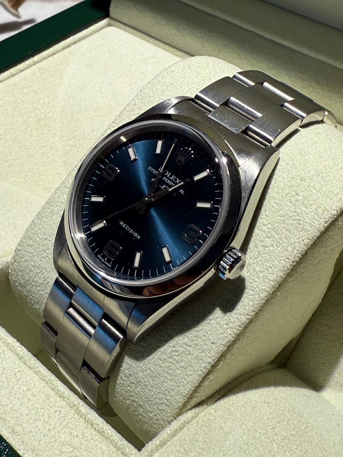 Marca Rolex Modello (Orologio) Air King Numero di referenza 14000M Carica Automatico Materiale della cassa Acciaio Materiale cinturino Acciaio Anno 1990/91 Condizione Ottimo (di seconda mano, segni di usura assenti o appena visibili) documenti originali, no box Carica Automatico Cassa Materiale della cassa Acciaio Diametro 34 mm Impermeabile 10 ATM Materiale lunetta Acciaio Vetro Vetro zaffiro Cinturino Materiale cinturino Acciaio Colore cinturino Acciaio Chiusura Déployante Materiale chiusura Acciaio - COMMISSIONE D’ASTA 25%