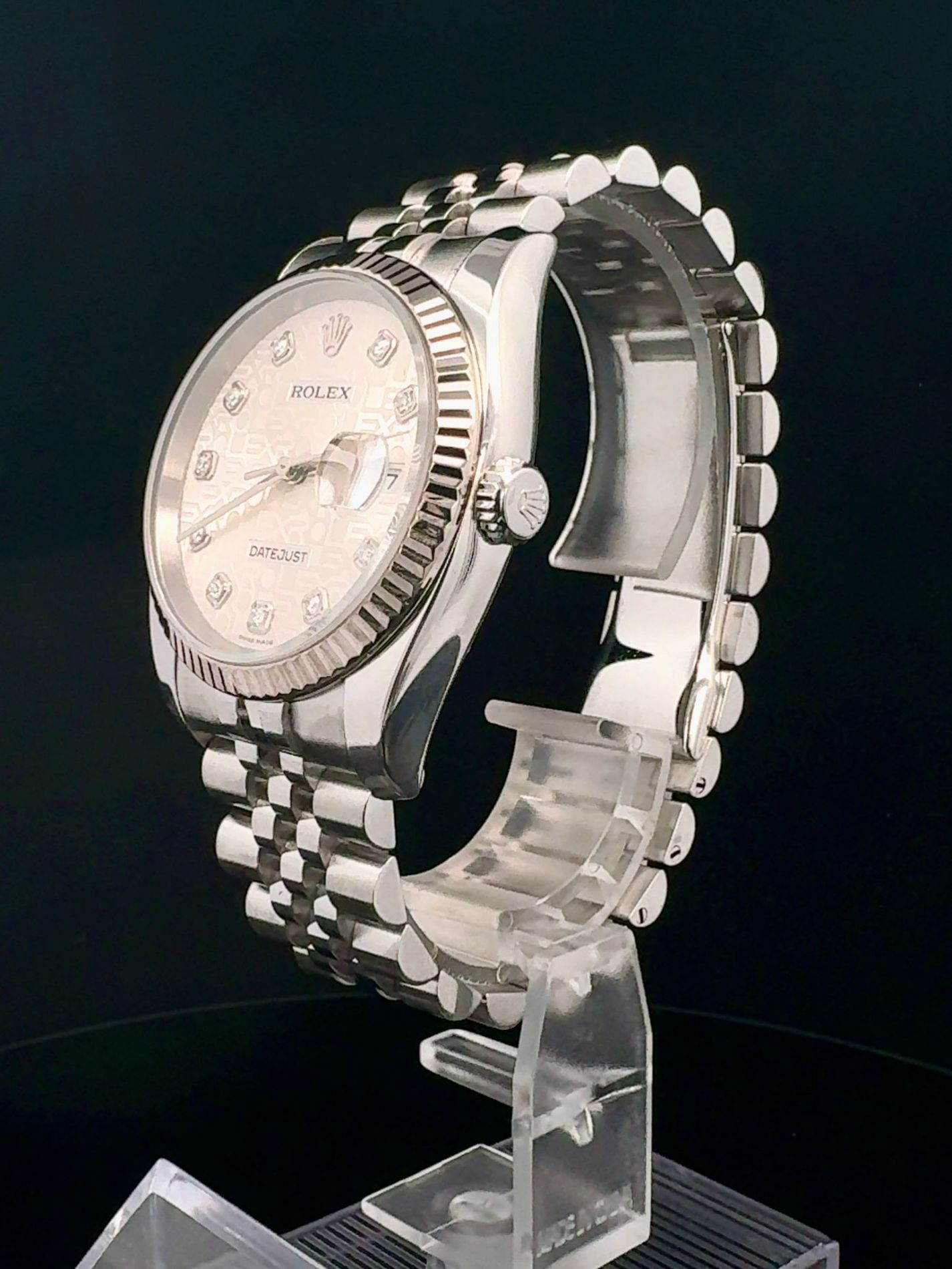 Marca Rolex Modello (Orologio) Datejust 36 Numero di referenza 116234 Carica Automatico Materiale della cassa Acciaio Materiale cinturino Acciaio Anno di produzione 2007 Condizione Usato (Ottimo) L'articolo presenta segni di usura lievi, come ad esempio graffi leggeri, ma non percepibili al tatto Corredo Con documenti originali, senza scatola originale Carica Automatico Cassa Materiale della cassa Acciaio Diametro 36 mm Impermeabile 10 ATM Materiale lunetta Oro bianco Vetro Vetro zaffiro Quadrante computer dial diamanti Cinturino Materiale cinturino Acciaio Colore cinturino Acciaio Materiale chiusura Acciaio Funzioni Data - COMMISSIONE D’ASTA 25%
