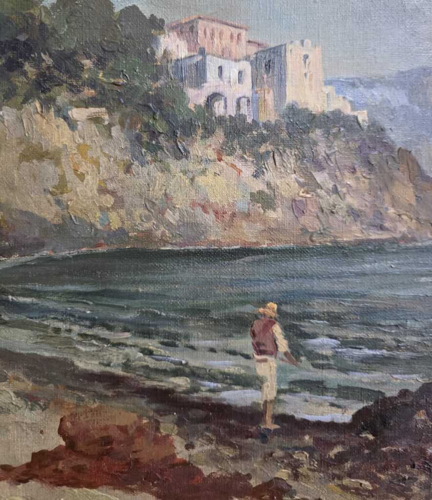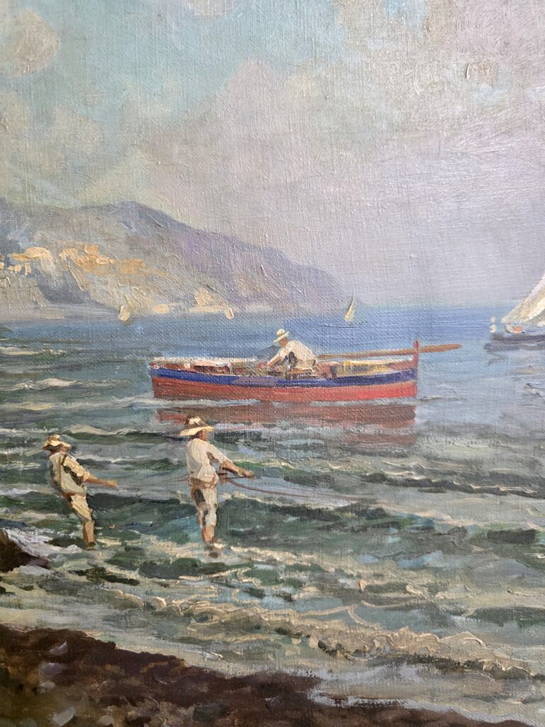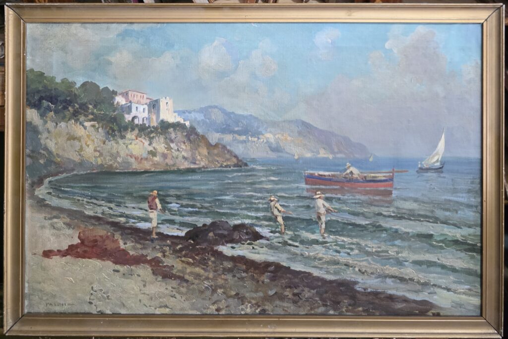 Artista italiano,XX secolo.Firma Pasini.Olio su tela.Cm.39 x 60. Misure: cm.39 x 60 senza cornice Misure: cm.43 x 64 con cornice Olio su tela Artista italiano, XX secolo Marina di Napoli con pescatori. Firma in basso a sinistra Pasini