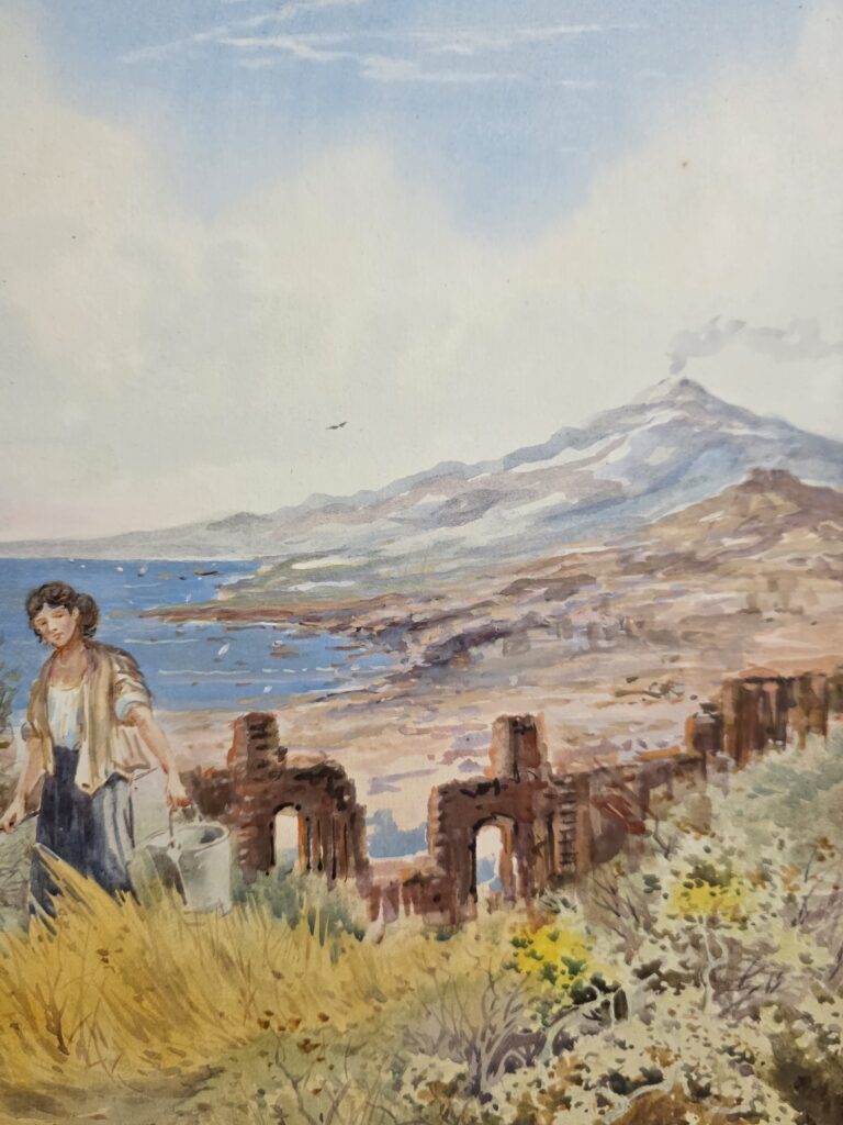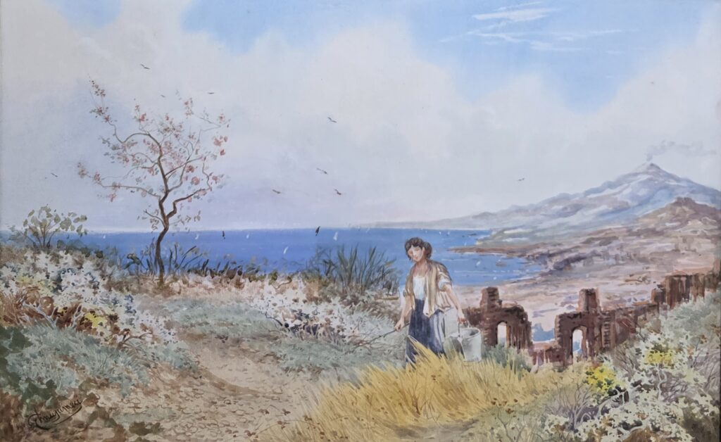 Giuseppe Musumeci(1902-?).Paesaggio con pastorella.Acquerello.Cm.31 x 47