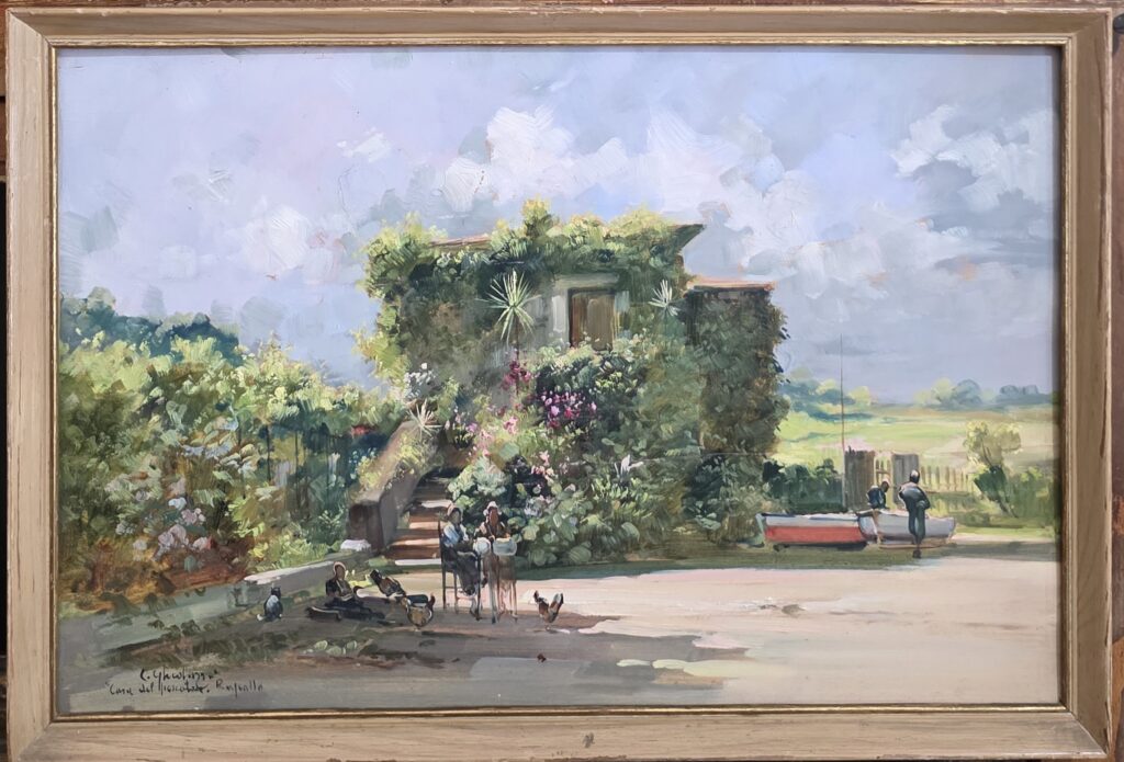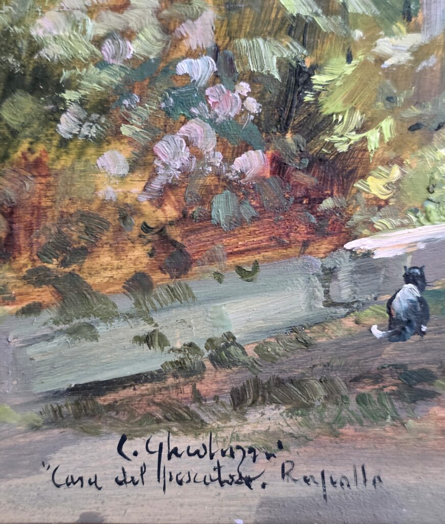 Cesare Gheduzzi(1894-1944).Olio su pannello.Cm.30 x 45,5 Misure: cm.30 x 45,5 senza cornice Misure: 33 x 48 con cornice Firma in basso a sinistra C.Gheduzzi Casa del pescatore, Rapallo