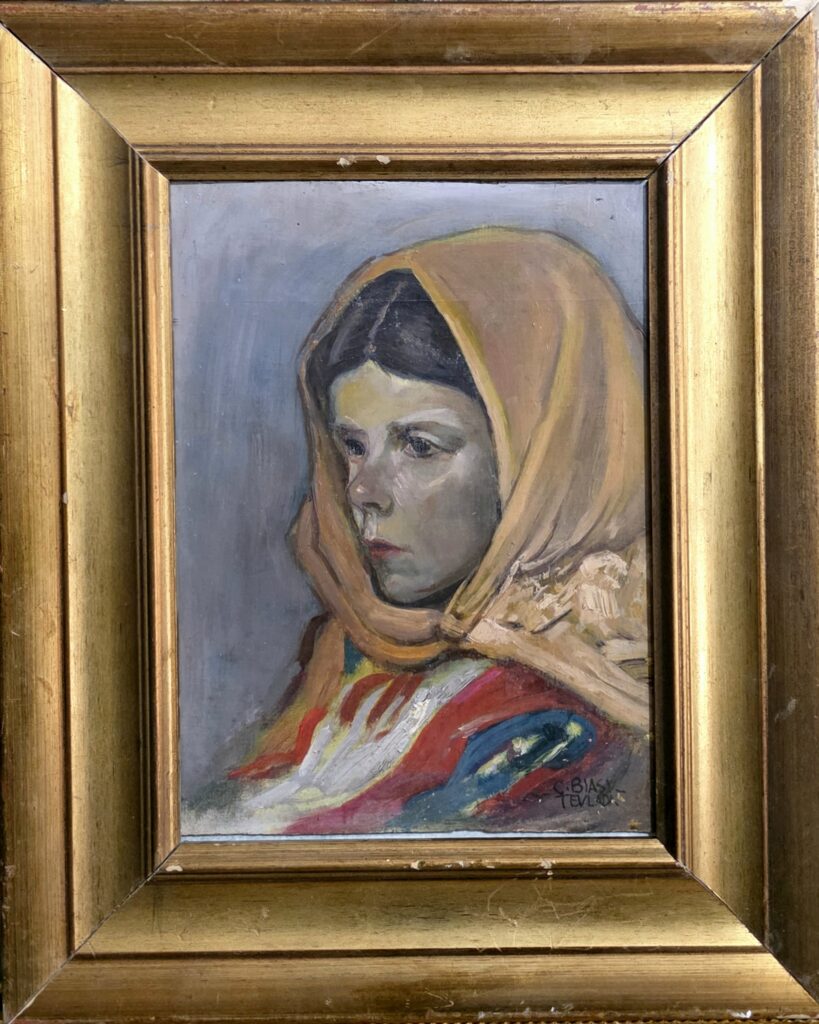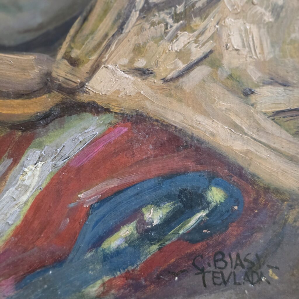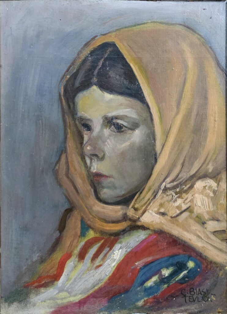 Giuseppe Biasi da Teulada(1885-1945).Ritratto di popolana.Cm.23 x 31 Misure: cm.23 x 31 senza cornice Misure: cm.38 x 47 con cornice Olio su pannello Firma in basso a destra C.Biasi Teulada.