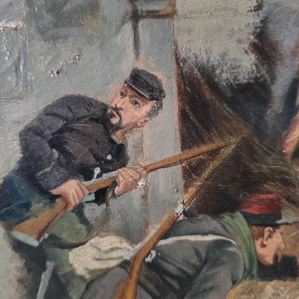 Alphonse Marie De Neuville(1835-1885).Seguace. Episodio guerra franco-prussiana.Cm.65 x 90 Misure: cm.65 x 90 senza cornice Misure: cm.83 x 112 con cornice Olio su tela. Episodio guerra franco prussiana Olio su tela