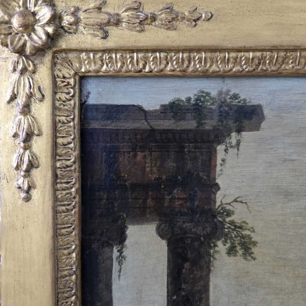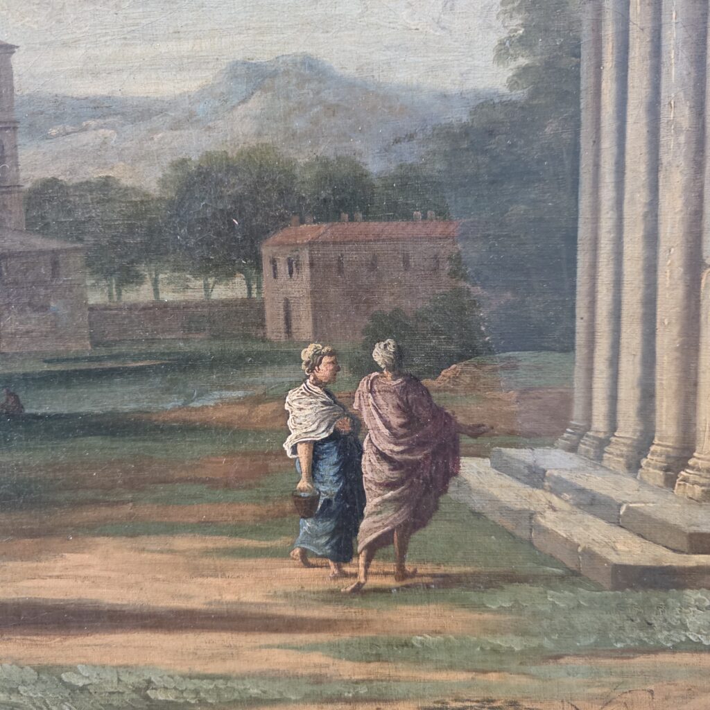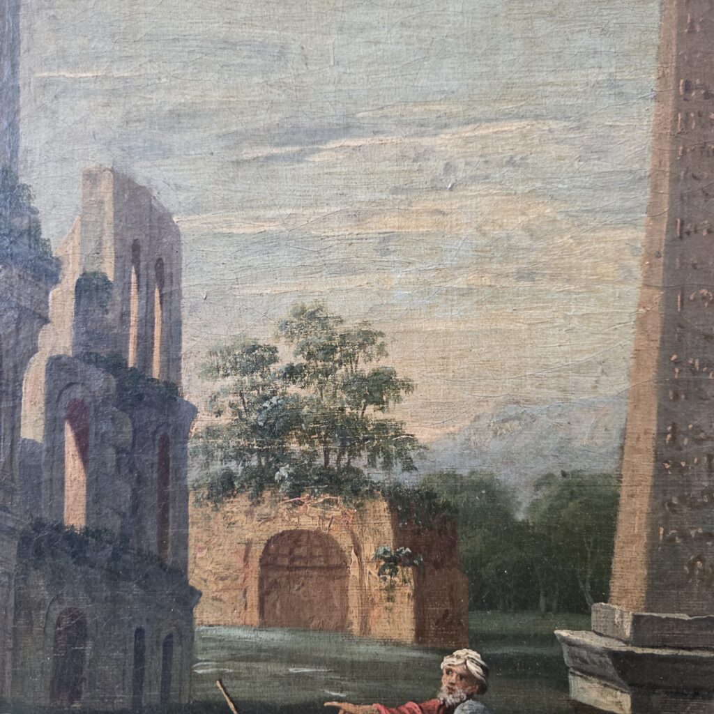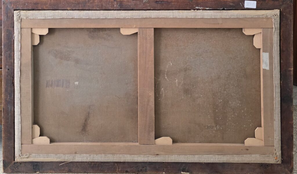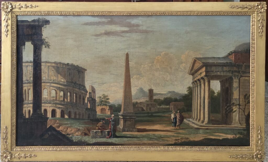 Scuola romana,XVIII secolo.Veduta di Roma.Cm.61 x 107 Misure: cm.61 x 107 senza cornice Misure: cm.71 x 117 con cornice Olio su tela Veduta di Roma